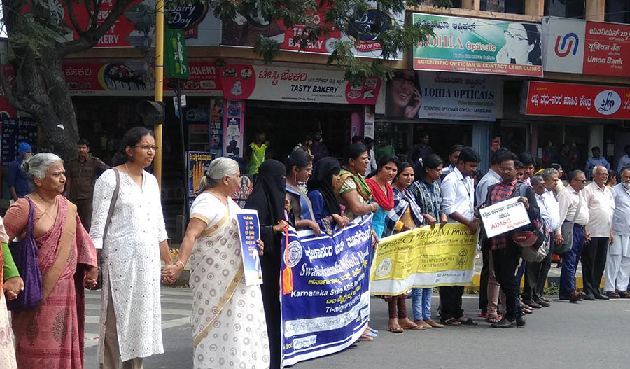 ನಗರದ ರಾಮಸ್ವಾಮಿ ವೃತ್ತದಲ್ಲಿ ಮಂಗಳವಾರ, ಕರ್ನಾಟಕ ಮಹಿಳಾ ದೌರ್ಜನ್ಯ ವಿರೋಧಿ ಒಕ್ಕೂಟ, ಅಖಿಲ ಭಾರತ ಪ್ರಗತಿಪರ ಮಹಿಳಾ ಸಂಘಟನೆ, ಅಖಿಲ ಭಾರತ ಮಹಿಳಾ ಸಾಂಸ್ಕೃತಿಕ ಸಂಗಟನೆ, ಪಿಯುಸಿಎಲ್, ಅಖಿಲ ಭಾರತ ಪ್ರಜಾ ರಂಗ ಸೇರಿದಂತೆ ಪ್ರಗತಿಪರ ಸಂಘಟನೆಗಳ ಒಕ್ಕೂಟದ ವತಿಯಿಂದ ಮಾನವ ಸರಪಳಿ ನಿರ್ಮಿಸಿ ಬೃಹತ್ ಪ್ರತಿಭಟನೆ ನಡೆಸಲಾಯಿತು.