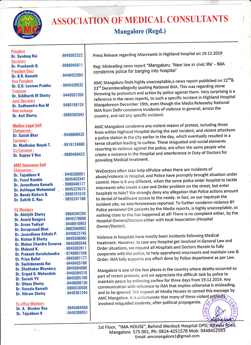 ಡಿ.19ರಂದು ಮಂಗಳೂರಿನಲ್ಲಿ ‘ಶಾಂತಿ ಕಾಪಾಡಲು ಪೊಲೀಸರು ಕರ್ಫ್ಯೂ ವಿಧಿಸಿ ಶ್ರಮಿಸಿದ್ದಾರೆ’ ಎಂದು ಹೇಳಿರುವ ಅಸೋಸಿಯೇಶನ್ ಇದಕ್ಕಾಗಿ ಅವರನ್ನು ಅಭಿನಂದಿಸಿದೆ. ಡಿ.22ರಂದು ಇಂಡಿಯನ್ ಮೆಡಿಕಲ್ ಅಸೋಸಿಯೇಶನ್ ಪೊಲೀಸರು ಆಸ್ಪತ್ರೆಯೊಳಗೆ ನುಗ್ಗುವುದನ್ನು ಖಂಡಿಸುವ ಪತ್ರಿಕಾ ಹೇಳಿಕೆ ಪ್ರಕಟಿಸಿತ್ತು.