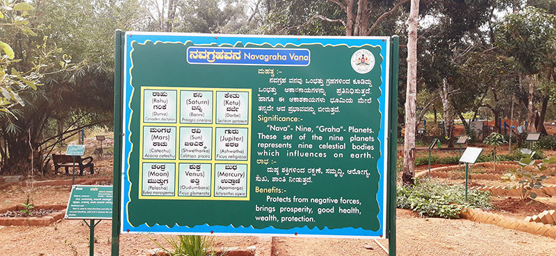 ಭೂ ಮಂಡಲದಲ್ಲಿ ಒಟ್ಟು ಒಂಬತ್ತು ಗ್ರಹಗಳಿವೆ ಎಂದು ಹಿಂದು ಧಾರ್ಮಿಕ ಅಚರಣೆಗಳಿಂದ ಹೇಳುತ್ತಾರೆ. ಈ ಒಂಬತ್ತು ಗ್ರಹಗಳು ಒಂದೊಂದು ಸಸ್ಯವನ್ನು ಪ್ರತಿನಿಧೀಕರಿಸುತ್ತದೆ. ಹಿಂದು ಧರ್ಮದ ನಂಬಿಕೆಗಳ ಪ್ರಕಾರ ಯಾರಿಗಾದರೂ ಯಾವುದಾದರೂ ಗ್ರಹಗಳಿಂದ ದೋಷ ಕಂಡು ಬಂದಲ್ಲಿ ಆ ಗ್ರಹಕ್ಕೆ ಒಳಪಡುವ ಸಸ್ಯವನ್ನು ಪೂಜಿಸಬಹುದು. ಇಂತಹ ಒಂದು ಸುಂದರ ನವಗ್ರಹವನವನ್ನು ಅನಂತ ಔಷಧಿ ವನದಲ್ಲಿ ನಿರ್ಮಿಸಲಾಗಿದೆ. ಈ ವನದಲ್ಲಿ ಒಂಬತ್ತು ಬಗೆಯ ಸಸ್ಯಗಳನ್ನು ದಿಕ್ಕಿಗನುಸಾರವಾಗಿ ನೆಡಲಾಗಿದೆ. ಮಾತ್ರವಲ್ಲದೇ ಅಯಾ ಸಸ್ಯಗಳ ಔಷಧೀಯ ಗುಣಗಳನ್ನು ವಿವರಿಸಲಾಗಿದೆ. ಉದಾಹರಣೆಗೆ ಸೂರ್ಯನಿಗೆ ಬಿಳಿ ಎಕ್ಕ ಗಿಡವನ್ನು, ಚಂದ್ರನಿಗೆ ಮುತ್ತುಗದ ಗಿಡವನ್ನು, ಮಂಗಳನಿಗೆ ಕಾಚುವಿನ ಗಿಡವನ್ನು ಹಾಗೆಯೇ ಉಳಿದ ಎಲ್ಲಾ ಗ್ರಹಗಳಿಗೆ ಒಂದೊಂದು ಸಸಿಗಳನ್ನು ನೆಡಲಾಗಿದೆ. ಪ್ರತೀ ಸಸ್ಯವು ಔಷಧೀಯ ಗುಣಗಳಿಂದ ಕೂಡಿದ್ದು ಇದು ಮಾನವನ ಜೀವನದಲ್ಲಿ ಮುಖ್ಯವಾದ ಪಾತ್ರವನ್ನು ವಹಿಸುತ್ತವೆ ಎನ್ನುವ ಸಂದೇಶಗಳು ಇಲ್ಲಿವೆ.