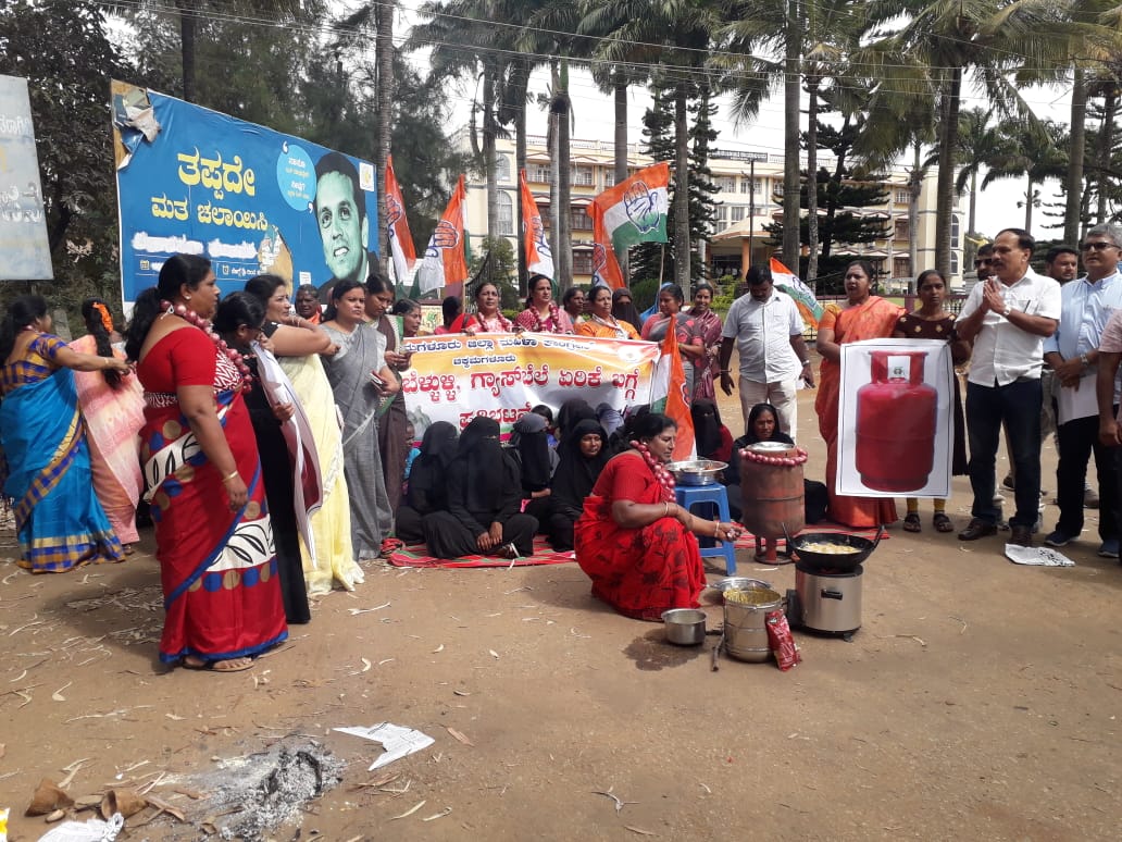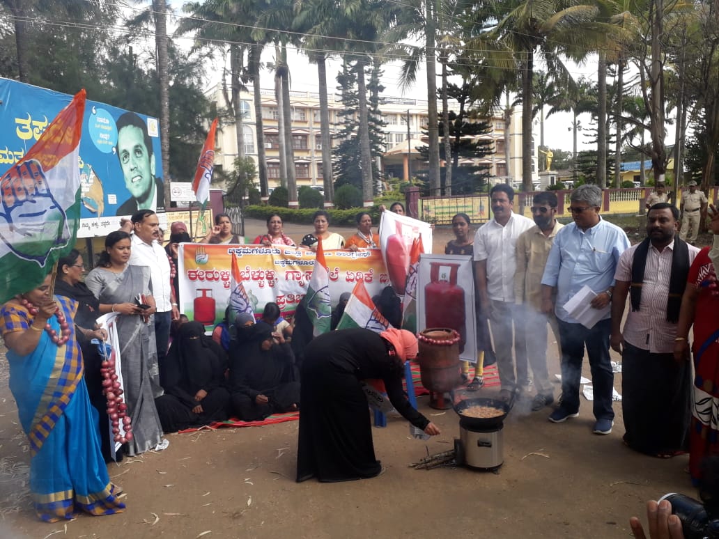 ಮಹಿಳಾ ಕಾಂಗ್ರೆಸ್ ಘಟಕದ ಅಧ್ಯಕ್ಷೆ ಯಶೋಧಮ್ಮ, ವನಮಾಲ ದೇವರಾಜ್, ಸುರೇಖಾ ಸಂಪತ್, ರೇಣುಕಾ, ರೇವತಿ ಹಾಗೂ ವಿಧಾನ ಪರಿಷತ್ ಮಾಜಿ ಸದಸ್ಯೆ ಗಾಯತ್ರಿ ಶಾಂತೇಗೌಡ ಮತ್ತಿತರ ಮುಖಂಡರು ಮತ್ತು ನೂರಾರು ಮಹಿಳಾ ಕಾರ್ಯಕರ್ತೆಯ ರೊಂದಿಗೆ ಜಿಲ್ಲಾ ಪಂಚಾಯತ್ ಕಚೇರಿ ಎದುರು ಕಟ್ಟಿಗೆಯಿಂದ ಬೆಂಕಿ ಉರಿಸಿ ಬೋಂಡಾ ತಯಾರಿಸಿ, ಕೈಗಳಲ್ಲಿ ಈರುಳ್ಳಿ ಹಾರ ಹಿಡಿದು, ಕೇಂದ್ರದ ಬಿಜೆಪಿ ಸರಕಾರ, ರಾಜ್ಯ ಸರಕಾರ, ಸಂಸದೆ ಶೋಭಾ ಕರಂದ್ಲಾಜೆ ಹಾಗೂ ಪ್ರಧಾನಿ ನರೇಂದ್ರ ಮೋದಿ ವಿರುದ್ಧ ಘೋಷಣೆಗಳನ್ನು ಕೂಗುತ್ತಾ ಕೇಂದ್ರ ಸರಕಾರ ಅಡುಗೆ ಅನಿಲ ಸೇರಿದಂತೆ ಅಗತ್ಯ ವಸ್ತುಗಳ ಬೆಲೆ ಏರಿಕೆ ನಿಯಂತ್ರಿಸು ವಲ್ಲಿ ಸಂಪೂರ್ಣವಾಗಿ ವಿಫಲವಾಗಿದೆ ಎಂದು ಆಕ್ರೋಶ ವ್ಯಕ್ತಪಡಿಸಿದರು.