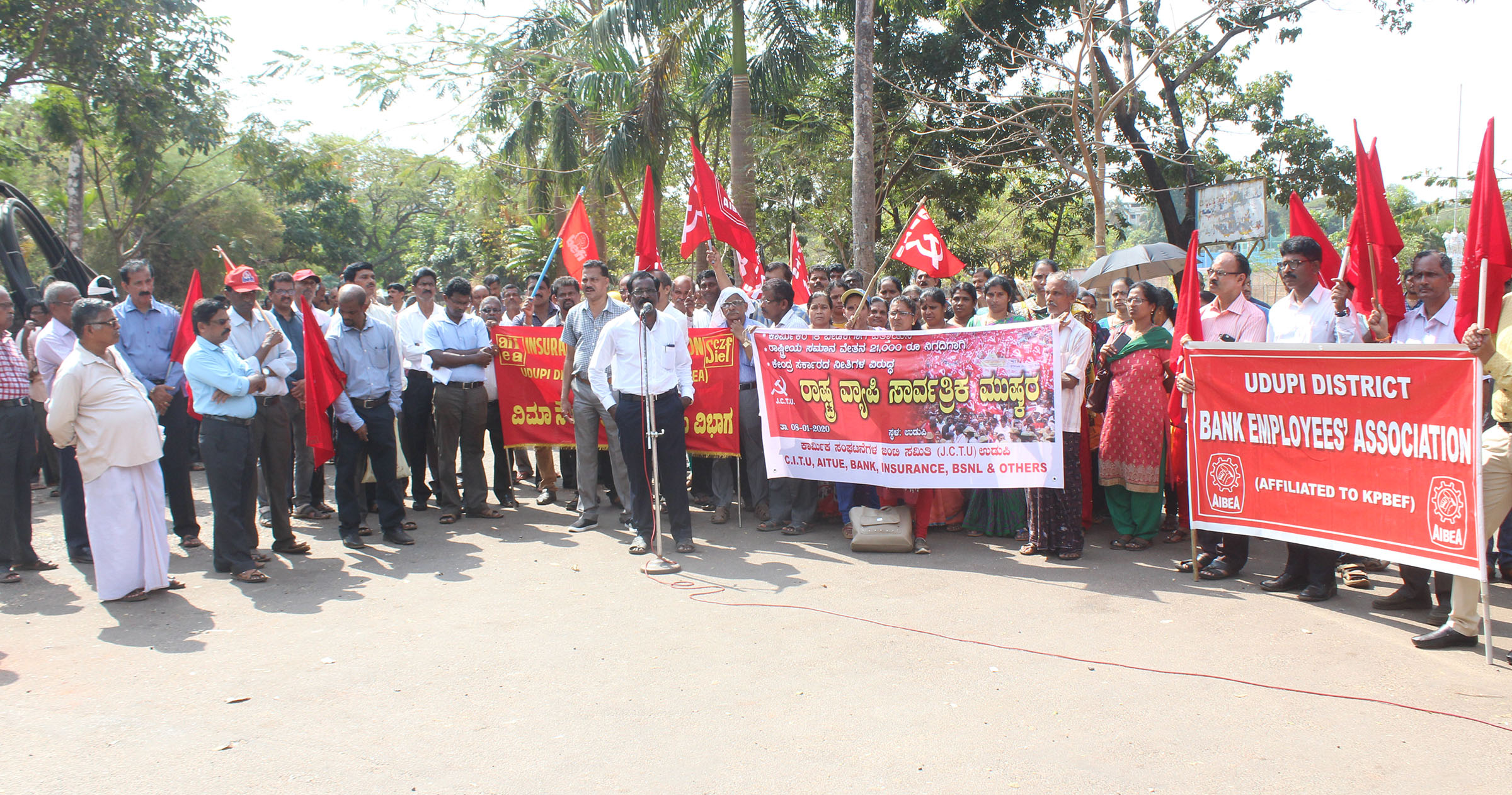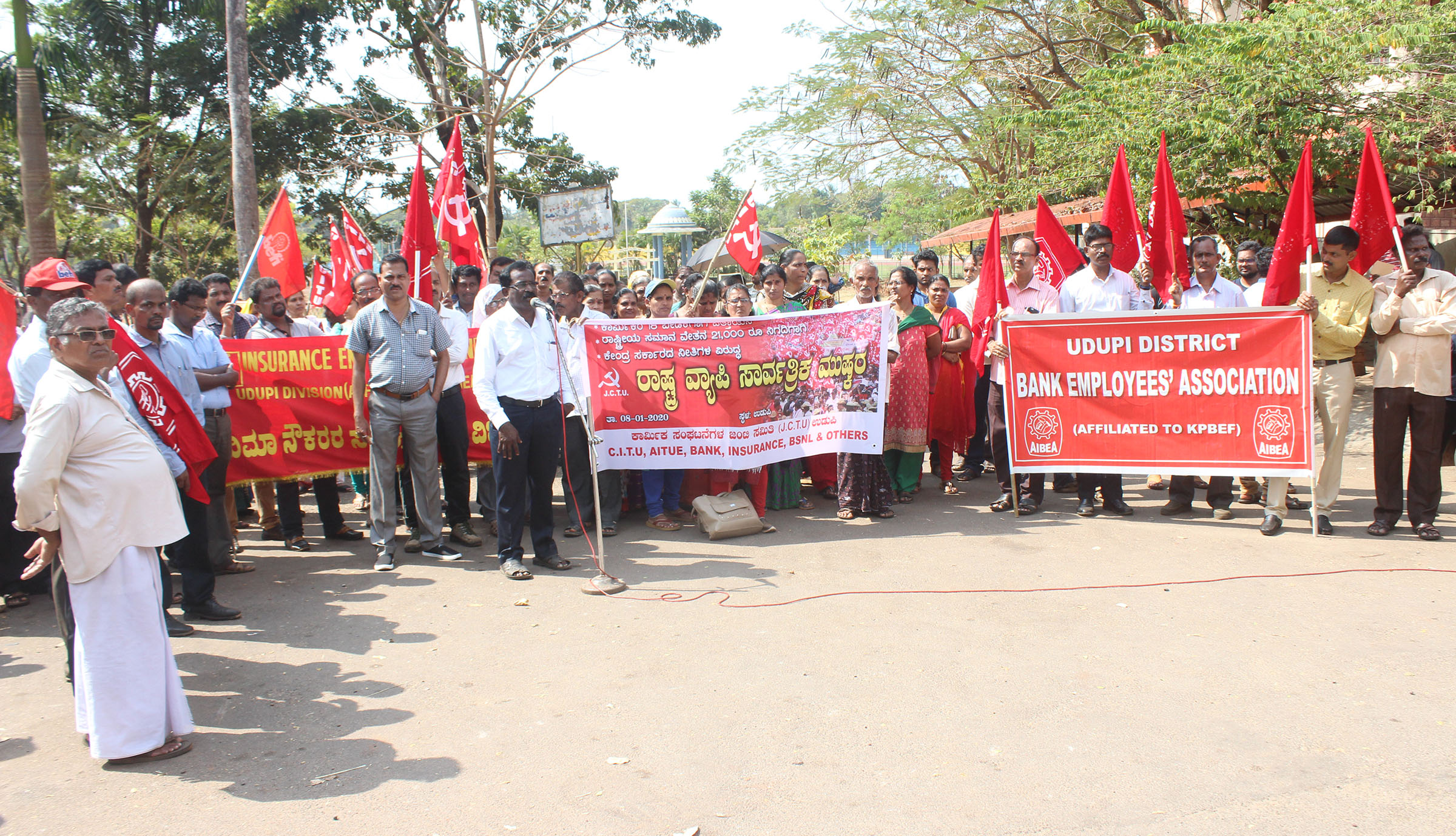 ಅಖಿಲ ಭಾರತ ಸಾರ್ವತ್ರಿಕ ಮುಷ್ಕರ : ಉಡುಪಿ ಜಿಲ್ಲೆಯಾದ್ಯಂತ ಕಾರ್ಮಿಕರಿಂದ ಧರಣಿ, ಮೆರವಣಿಗೆ