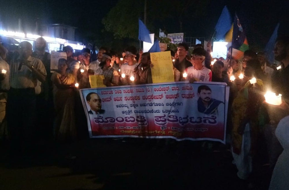 ಬ್ರಹ್ಮಾವರ, ಜ.9: ಬಂಧಿತ ಯುವ ಹೋರಾಟಗಾರ ಚಂದ್ರಶೇಖರ್ ಆಝಾದ್ ರಾವಣ್ ರನ್ನು ಕೂಡಲೇ ಸೂಕ್ತ ಚಿಕಿತ್ಸೆಗಾಗಿ ಆಸ್ಪತ್ರೆಗೆ ದಾಖಲಿಸ ಬೇಕೆಂದು ಒತ್ತಾಯಿಸಿ ದಲಿತ ಸಂಘರ್ಷ ಸಮಿತಿ(ಅಂಬೇಡ್ಕರ್ವಾದ) ಉಡುಪಿ ಜಿಲ್ಲೆ ಇದರ ನೇತೃತ್ವದಲ್ಲಿ ಮೊಂಬತ್ತಿ ಪ್ರತಿಭಟನೆಯನ್ನು ಇಂದು ಬ್ರಹ್ಮಾವರ ಬಸ್ ನಿಲ್ದಾಣದಲ್ಲಿ ಹಮ್ಮಿಕೊಳ್ಳಲಾಗಿತ್ತು.