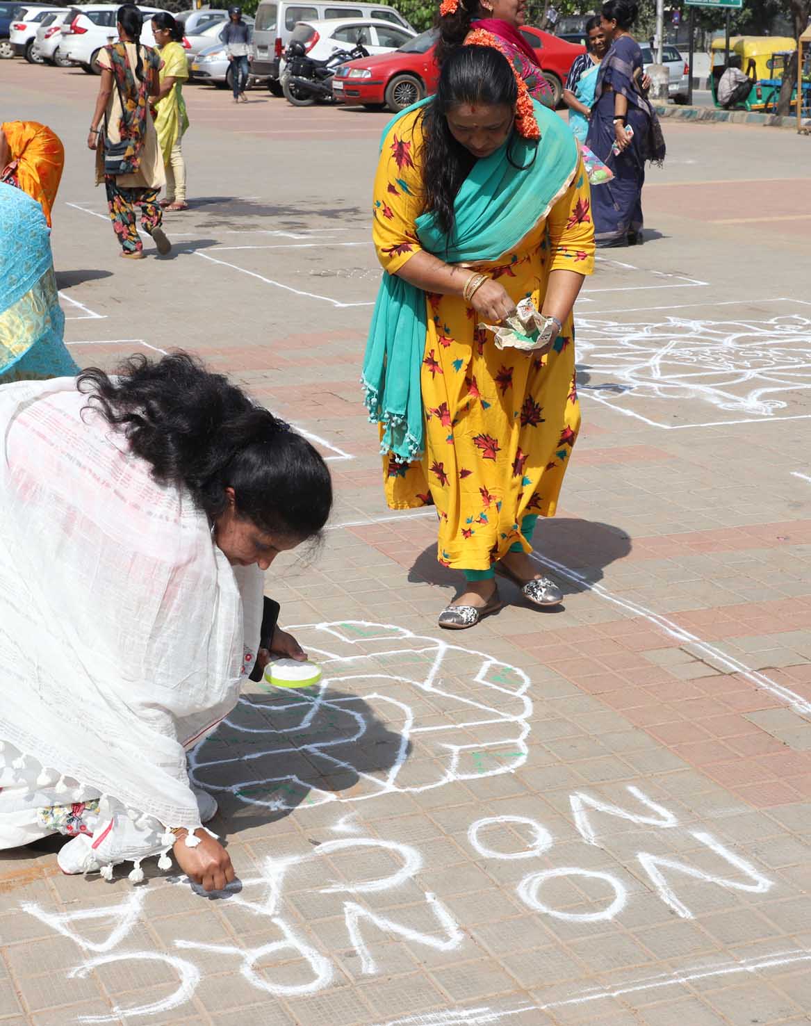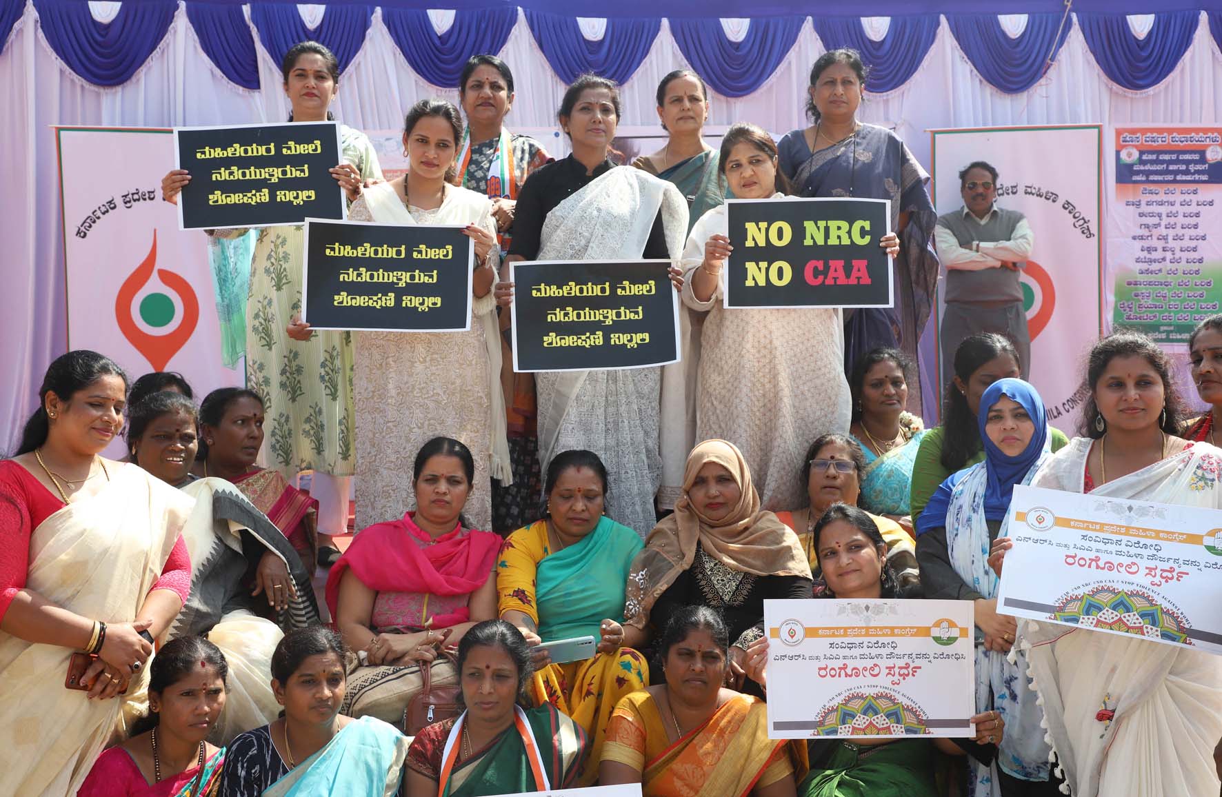 ಗುರುವಾರ ನಗರದ ಸ್ವಾತಂತ್ರ ಉದ್ಯಾನವನ ಮೈದಾನದಲ್ಲಿ ರಾಜ್ಯ ಮಹಿಳಾ ಕಾಂಗ್ರೆಸ್ ನೇತೃತ್ವದಲ್ಲಿ ಜಮಾಯಿಸಿದ ಮಹಿಳಾ ಸದಸ್ಯೆಯರು, ನೊ ಸಿಎಎ, ನೊ ಎನ್ಆರ್ಸಿ, ನೊ ಅಟ್ರಾಸಿಟಿ ಆನ್ ವುಮೆನ್, ಗೋ ಬ್ಯಾಕ್ ನರೇಂದ್ರ ಮೋದಿ ಎಂಬ ಘೋಷವಾಕ್ಯಗಳನ್ನು ರಂಗೋಲಿಯಲ್ಲೇ ಬಿಡಿಸುವ ಮೂಲಕ ಮಹಿಳೆಯರು ಆಕ್ರೋಶ ವ್ಯಕ್ತಪಡಿಸಿದರು.
