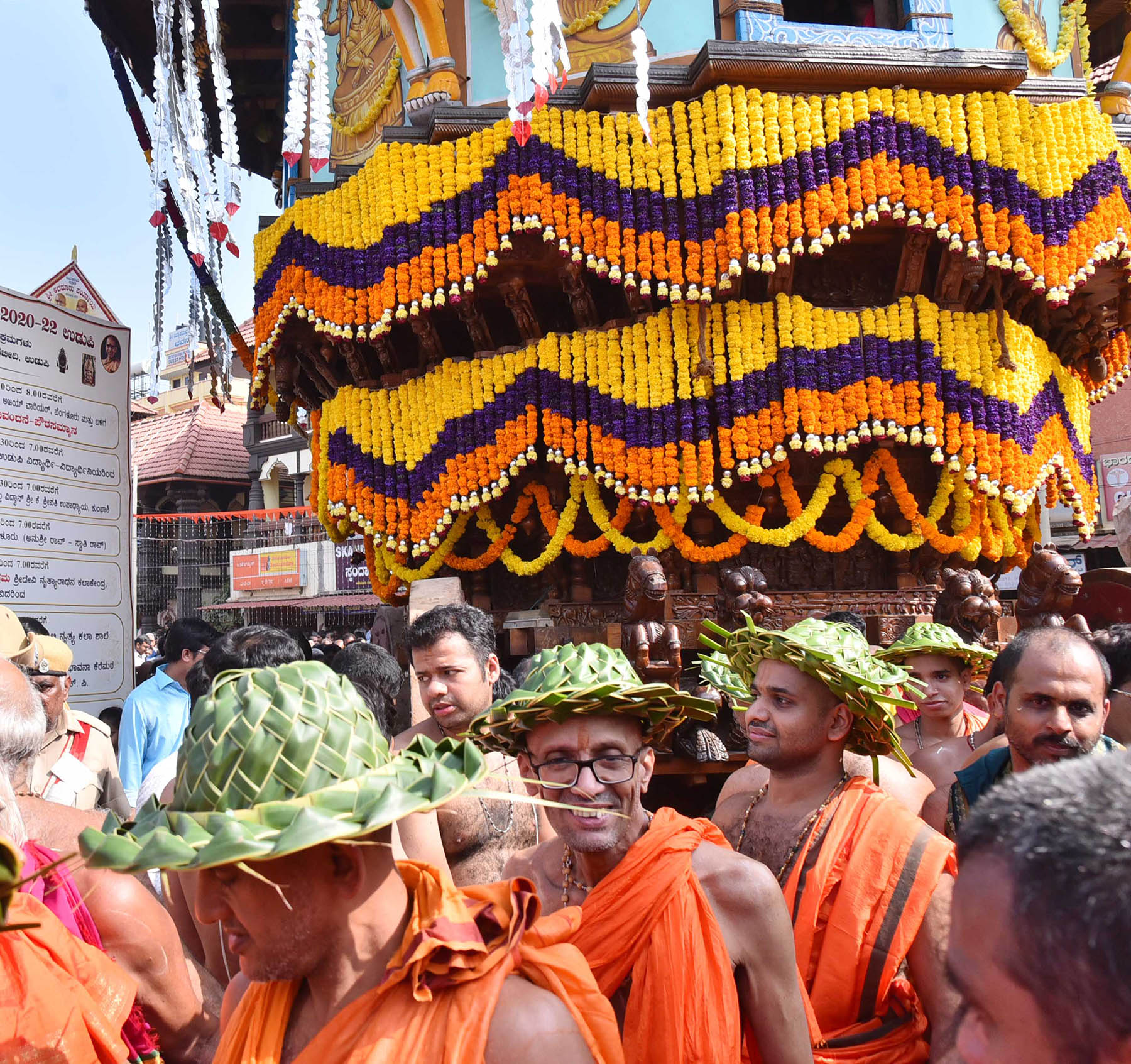 ಪೂಜೆಯ ಬಳಿಕ ಶ್ರೀಕೃಷ್ಣ-ಮುಖ್ಯಪ್ರಾಣ ದೇವರನ್ನು ಚಿನ್ನದ ಪಾಲಕ್ಕಿಯಲ್ಲಿ ತಂದು ಸ್ವಾಗತ ಗೋಪುರದ ಎದುರು ನಿಲ್ಲಿಸಲಾದ ಬ್ರಹ್ಮರಥದಲ್ಲಿ ಪ್ರತಿಷ್ಠಾಪಿಸಲಾಯಿತು. ಎಲ್ಲಾ ಸ್ವಾಮೀಜಿಗಳು ರಥವನ್ನೇರಿ ಮಂಗಳಾರತಿ ಬೆಳಗಿದ ಬಳಿಕ ರಥವನ್ನು ರಥಬೀದಿಗೆ ಒಂದು ಸುತ್ತ ಪ್ರದಕ್ಷಿಣೆ ತರಲಾಯಿತು.