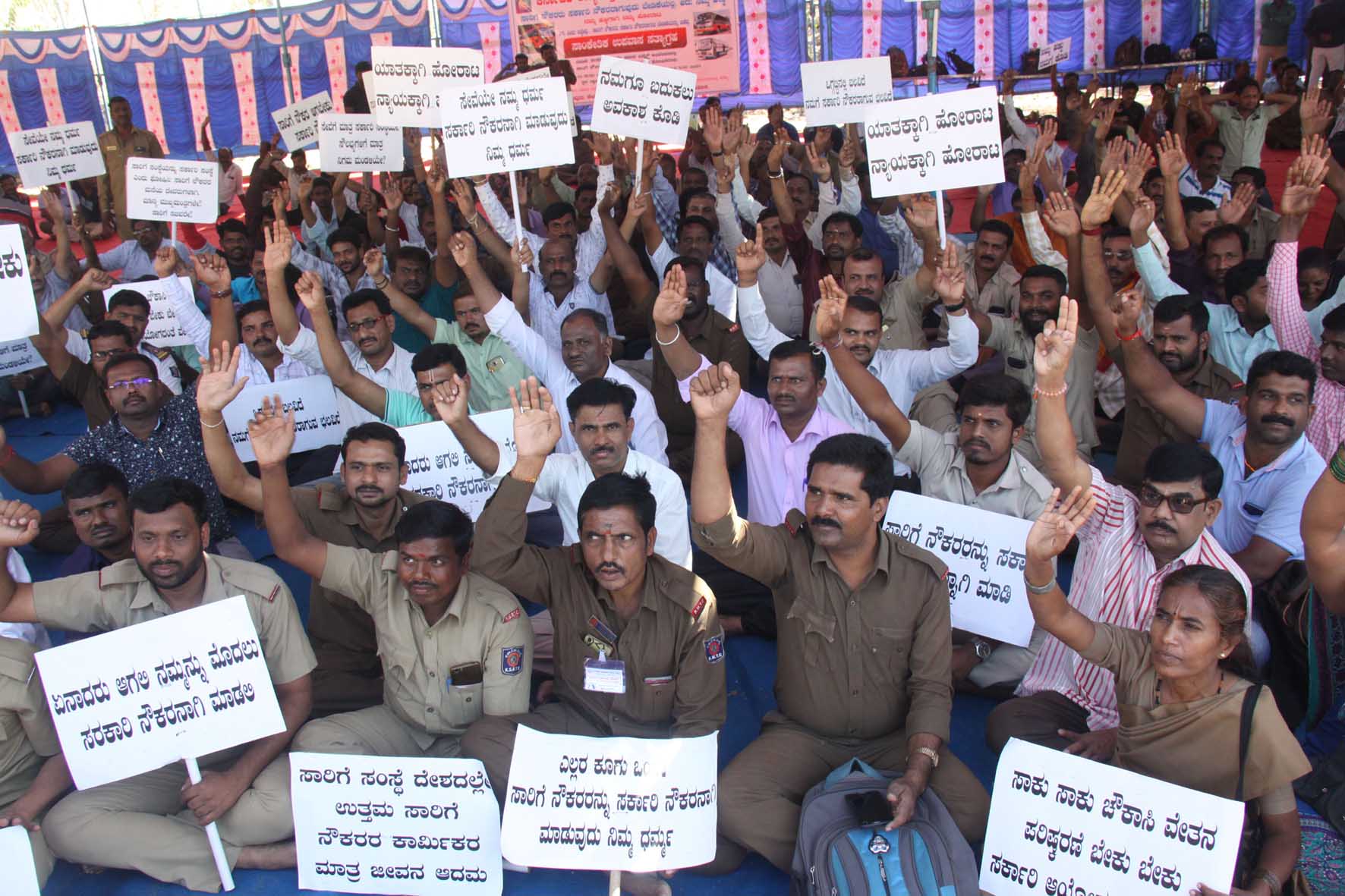 ಸಾರಿಗೆ ನೌಕರರನ್ನು ಸರಕಾರಿ ನೌಕರರಾಗಿ ಪರಿಗಣಿಸಲು ಆಗ್ರಹಿಸಿ ಧರಣಿ
