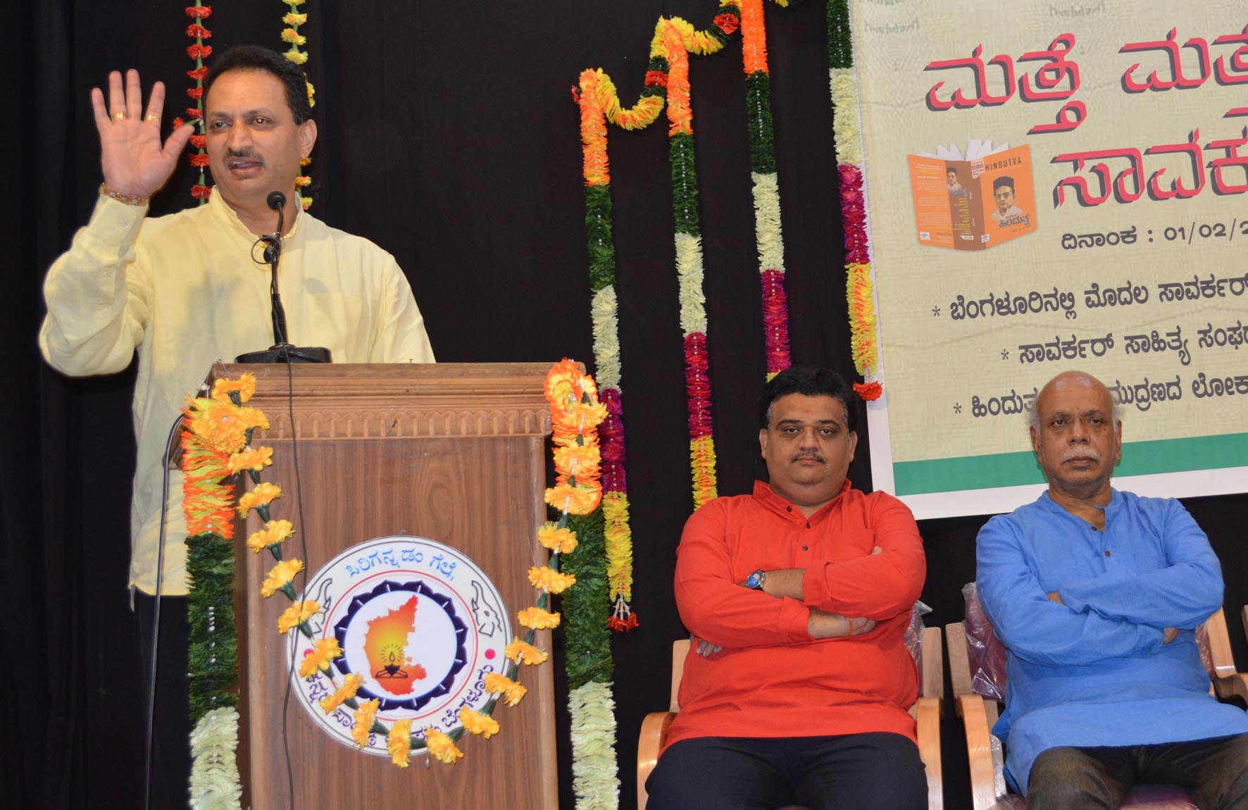ಶನಿವಾರ ನಗರದ ಕನ್ನಡ ಸಾಹಿತ್ಯ ಪರಿಷತ್ತಿನಲ್ಲಿ ಸಾವರ್ಕರ್ ಸಾಹಿತ್ಯ ಸಂಘದ ವತಿಯಿಂದ ಆಯೋಜಿಸಿದ್ದ 'ಮತ್ತೆ ಮತ್ತೆ ಸಾವರ್ಕರ್' ವಿಚಾರ ಸಂಕಿರಣ ಹಾಗೂ ಹಿಂದುತ್ವ ಕೃತಿಯ 10ನೇ ಮುದ್ರಣ ಲೋರ್ಕಾಪಣಾ ಸಮಾರಂಭದಲ್ಲಿ ಪಾಲ್ಗೊಂಡು ಅವರು ಮಾತನಾಡಿದರು.