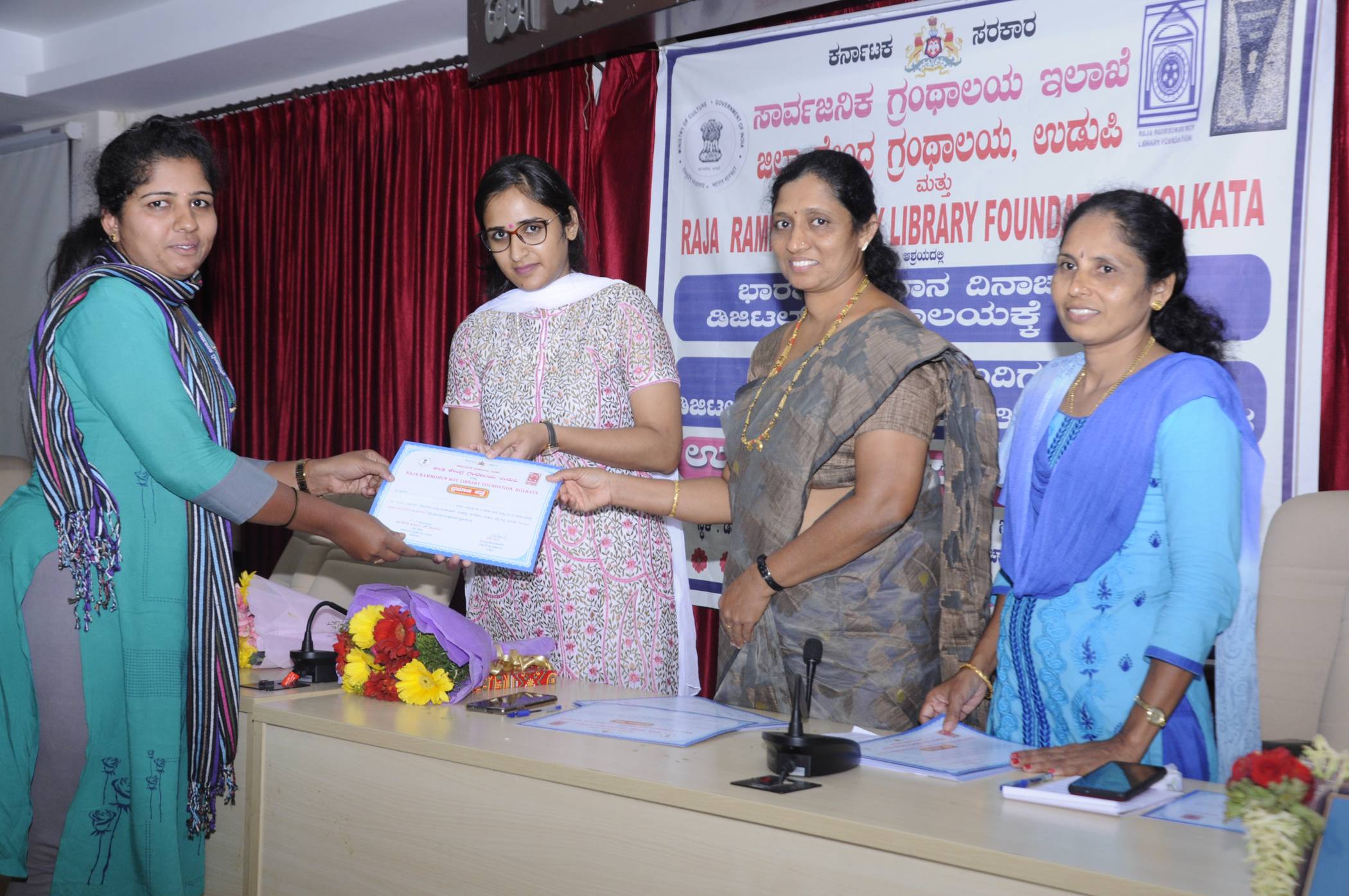 ಮಣಿಪಾಲದ ಜಿಪಂನ ಡಾ.ವಿ.ಎಸ್.ಆಚಾರ್ಯ ಸಭಾಂಗಣದಲ್ಲಿ ಸಾರ್ವಜನಿಕ ಗ್ರಂಥಾಲಯ ಇಲಾಖೆ ಹಾಗೂ ಜಿಲ್ಲಾ ಕೇಂದ್ರ ಗ್ರಂಥಾಲಯ ಉಡುಪಿ ಸಹಭಾಗಿತ್ವದಲ್ಲಿ ಜಿಲ್ಲೆಯ ಗ್ರಾಪಂ ಗ್ರಂಥಾಲಯಗಳ ಮೇಲ್ವಿಚಾರಕ ರಿಗಾಗಿ ಹಮ್ಮಿಕೊಂಡ ಡಿಜಿಟಲ್ ಗ್ರಂಥಾಲಯ ತರಬೇತಿ ಕಾರ್ಯಾಗಾರದ ಸಮಾರೋಪ ಕಾರ್ಯಾಗಾರದಲ್ಲಿ ಭಾಗವಹಿಸಿ ಪ್ರಮಾಣ ಪತ್ರ ವಿತರಿಸಿ ಮಾತನಾಡುತಿದ್ದರು.
