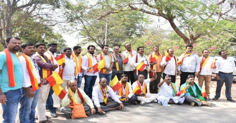 ಮೈಸೂರು: ಸರೋಜಿನಿ ಮಹಿಷಿ ವರದಿ ಜಾರಿಗೆ ಒತ್ತಾಯಿಸಿ ಕನ್ನಡ ಹೋರಾಟಗಾರರ ಧರಣಿ