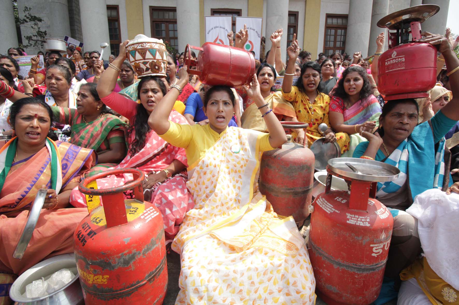 ಶುಕ್ರವಾರ ನಗರದ ಪುರಭವನ ಮುಂಭಾಗ ಕರ್ನಾಟಕ ಪ್ರದೇಶದ ಮಹಿಳಾ ಕಾಂಗ್ರೆಸ್ ನೇತೃತ್ವದಲ್ಲಿ ಜಮಾಯಿಸಿದ ಕಾರ್ಯಕರ್ತರು, ಕೇಂದ್ರದ ಜನವಿರೋಧಿ ನೀತಿಗಳನ್ನು ಖಂಡಿಸಿ ಖಾಲಿ ಸಿಲಿಂಡರ್ಗಳೊಂದಿಗೆ ಪ್ರತಿಭಟಿಸಿ ಗಮನ ಸೆಳೆದರು.