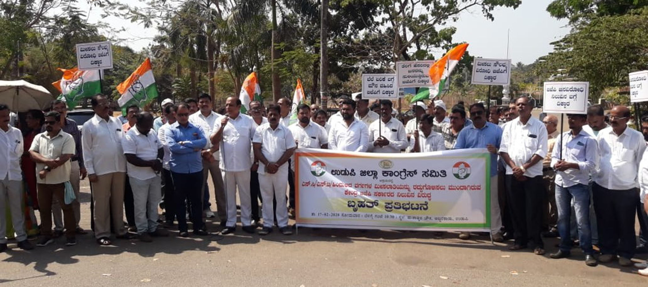 ಉಡುಪಿ ಜಿಲ್ಲಾ ಕಾಂಗ್ರೆಸ್ ಸಮಿತಿ ವತಿಯಿಂದ ಪರಿಶಿಷ್ಟ ಜಾತಿ/ಪರಿಶಿಷ್ಟ ಪಂಗಡ ಹಾಗೂ ಹಿಂದುಳಿದ ವರ್ಗಗಳ ಮೀಸಲಾತಿಯನ್ನು ರದ್ದು ಗೊಳಿಸಲು ಮುಂದಾಗಿರುವ ಕೇಂದ್ರದ ಬಿಜೆಪಿ ಸರಕಾರದ ಜನವಿರೋಧಿ ನಿಲುವುಗಳ ವಿರುದ್ಧ ಅಜ್ಜರಕಾಡು ಹುತಾತ್ಮರ ಸ್ಮಾರಕರ ಮುಂಭಾಗ ಸೋಮವಾರ ಹಮ್ಮಿಕೊಳ್ಳಲಾಗಿದ್ದಪ್ರತಿಭಟನೆಯಲ್ಲಿ ಭಾವಹಿಸಿ ಅವರು ಮಾತನಾಡುತಿದ್ದರು.