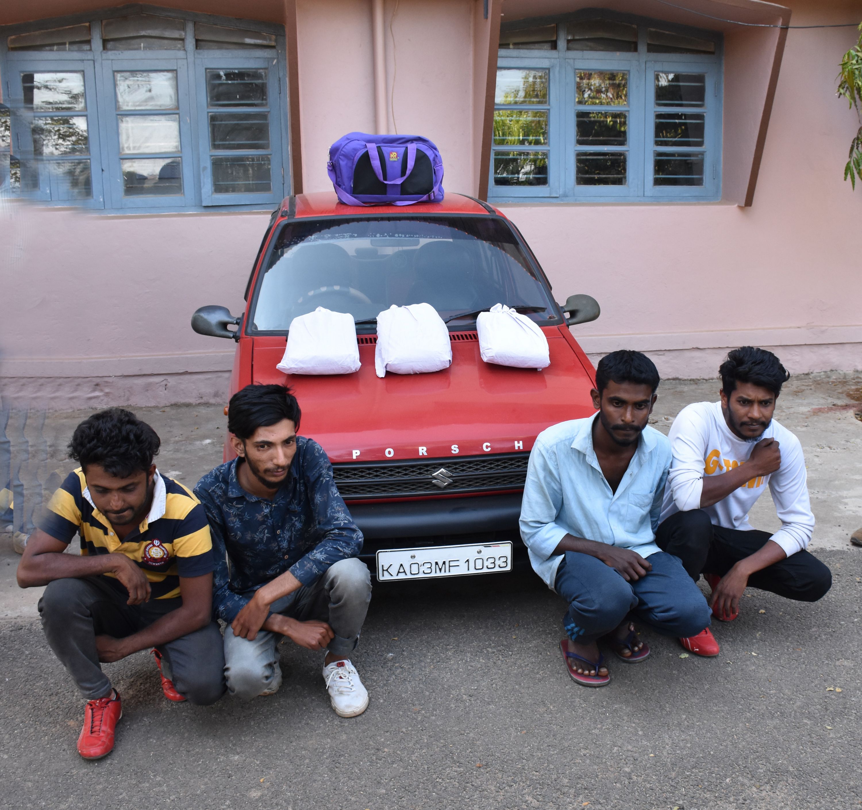ಅದರಂತೆ ಫೆ.20ರಂದು ರಾತ್ರಿ ವೇಳೆಯಲ್ಲಿ 4 ಮಂದಿ ಆರೋಪಿಗಳು ಕೆಂಪು ಬಣ್ಣದ ಮಾರುತಿ 800 ಕಾರಿನಲ್ಲಿ ಮೈಸೂರಿನಿಂದ ಸುಂಟಿಕೊಪ್ಪದ ಕಡೆಗೆ ಬರುತ್ತಿದ್ದಾಗ ಕುಶಾಲನಗರ ಮಡಿಕೇರಿ ರಾಷ್ಟ್ರೀಯ ಹೆದ್ದಾರಿ 275ರ ಬಸವನಹಳ್ಳಿ ಬಳಿ ಪೊಲೀಸರು ಮತ್ತು ಎಸಿಎಫ್ ನೆಹರು ಅವರನ್ನೊಳಗೊಂಡ ತಂಡ ಕಾರನ್ನು ತಪಾಸಣೆಗೆ ಒಳಪಡಿಸಿದರು. ಈ ಸಂದರ್ಭ ಕಾರಿನ ಡಿಕ್ಕಿಯಲ್ಲಿ ಒಂದು ಕಿಟ್ ಬ್ಯಾಗ್ನಲ್ಲಿ ಖಾಕಿ ಬಣ್ಣದ ಟೇಪ್ ಸುತ್ತಿದ್ದ 3 ಬಂಡಲ್ಗಳು ಇರುವುದು ಕಂಡು ಬಂದಿತ್ತು. ಅವುಗಳನ್ನು ತೆರೆದು ನೋಡಿದಾಗ 6 ಕೆ.ಜಿ. 70 ಗ್ರಾಂ ಒಣ ಗಾಂಜಾ ಪತ್ತೆಯಾಗಿದೆ.