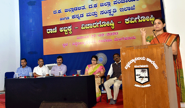 ಮಂಗಳೂರು, ಫೆ. 27: ದೇಶದಲ್ಲೇ ಮೊದಲ ಬಾರಿಗೆ ವಿದೇಶೀಯರ ವಿರುದ್ಧ ಹೋರಾಟ ನಡೆಸಿದ ಕೀರ್ತಿ ರಾಣಿಅಬ್ಬಕ್ಕರಿಗೆ ಸಲ್ಲುತ್ತದೆ. ಇದು ನಮ್ಮ ಹೆಮ್ಮೆಯಾಗಬೇಕು ಎಂದು ದ.ಕ. ಜಿಲ್ಲಾಧಿಕಾರಿ ಸಿಂಧೂ ಬಿ.ರೂಪೇಶ್ ಅಭಿಪ್ರಾಯಿಸಿದ್ದಾರೆ. ವೀರರಾಣಿ ಅಬ್ಬಕ್ಕ ಉ್ಸತವ ಪೂರ್ವಭಾವಿಯಾಗಿ ಮಂಗಳೂರು ವಿಶ್ವವಿದ್ಯಾನಿಲಯದ ರವೀಂದ್ರ ಕಲಾ ಭವನದಲ್ಲಿ ಗುರುವಾರ ಆಯೋಜಿಸಿದ್ದ ರಾಣಿ ಅಬ್ಬಕ್ಕ ವಿಚಾರಗೋಷ್ಠಿ-ಕವಿಗೋಷ್ಠಿ ಉದ್ಘಾಟಿಸಿ ಅವರು ಮಾತನಾಡುತ್ತಿದ್ದರು.