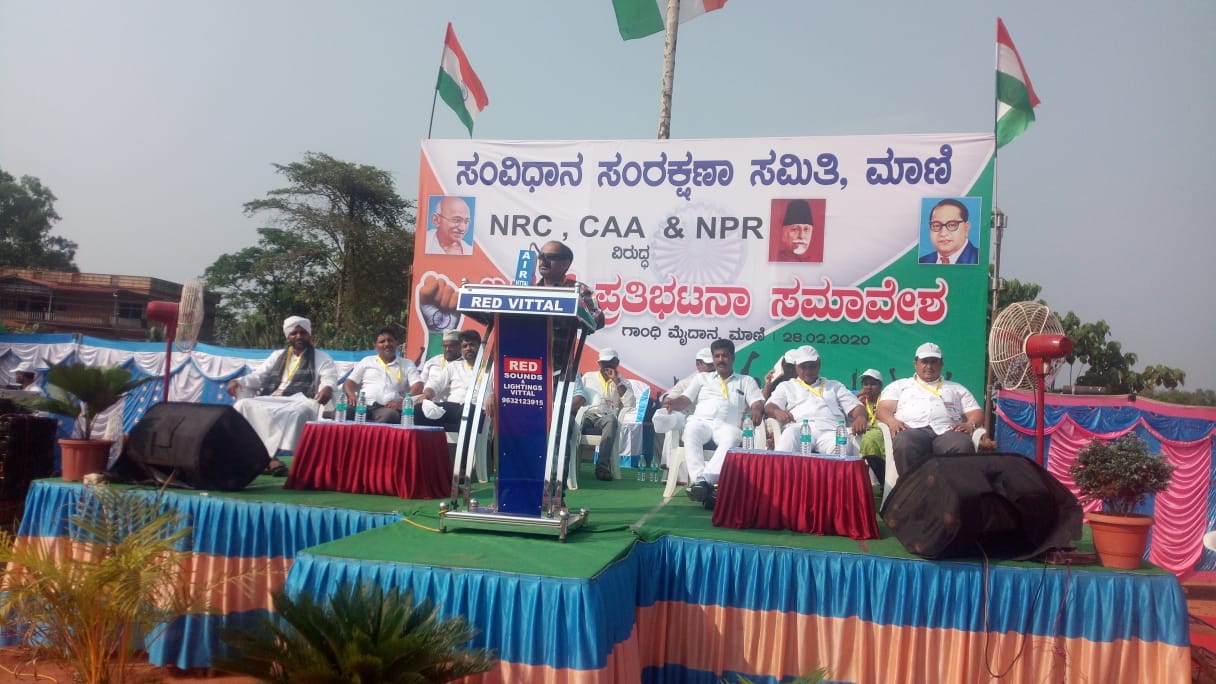 ಸಂವಿಧಾನ ಸಂರಕ್ಷಣಾ ಸಮಿತಿ ಮಾಣಿ ಇದರ ವತಿಯಿಂದ ಪೌರತ್ವ ತಿದ್ದುಪಡಿ ಕಾಯ್ದೆ (ಸಿಎಎ), ರಾಷ್ಟ್ರೀಯ ಪೌರತ್ವ ನೋಂದಣಿ (ಎನ್ಆರ್ಸಿ), ರಾಷ್ಟ್ರೀಯ ಜನಸಂಖ್ಯಾ ನೋಂದಣಿ(ಎನ್ಪಿಆರ್)ಯನ್ನು ವಿರೋಧಿಸಿ ಮಾಣಿಯ ಗಾಂಧಿ ಮೈದಾನದಲ್ಲಿ ಶುಕ್ರವಾರ ಹಮ್ಮಿಕೊಂಡಿದ್ದ ಬೃಹತ್ ಪ್ರತಿಭಟನಾ ಸಮಾವೇಶವನ್ನು ಉದ್ದೇಶಿಸಿ ಅವರು ಮಾತನಾಡಿದರು.