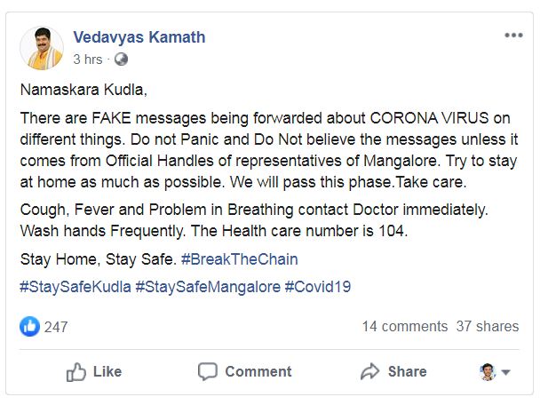 ‘ಕೊರೋನ ಸೋಂಕಿನ ಬಗ್ಗೆ ಸಾಮಾಜಿಕ ಜಾಲತಾಣದಲ್ಲಿ ನಕಲಿ ಸುದ್ದಿಗಳು ಹರಿದಾಡುತ್ತಿದ್ದು, ಇವುಗಳ ಬಗ್ಗೆ ಯಾರೂ ಭಯಪಡುವ ಅಗತ್ಯವಿಲ್ಲ. ಇಂತಹ ಸುಳ್ಳು ಸುದ್ದಿಗಳನ್ನು ನಂಬಲೇಬಾರದು. ಸಾಧ್ಯವಾದರೆ ಮಂಗಳೂರಿಗರು ಮನೆಯಲ್ಲಿಯೇ ಇರಬೇಕು. ಜನತೆಯು ಸುರಕ್ಷತೆಗೆ ಗಮನ ನೀಡಬೇಕು. ಕೆಮ್ಮು, ಶೀತ, ಜ್ವರ ಕಂಡುಬಂದಲ್ಲಿ ಕೂಡಲೇ ವೈದ್ಯರನ್ನು ಸಂಪರ್ಕಿಸಬೇಕು’ ಎಂದು ಶಾಸಕ ವೇದವ್ಯಾಸ ಕಾಮತ್ ತಮ್ಮ ಅಧಿಕೃತ ಫೇಸ್ಬುಕ್ ಖಾತೆಯಲ್ಲಿ ಬರೆದುಕೊಂಡಿದ್ದಾರೆ.