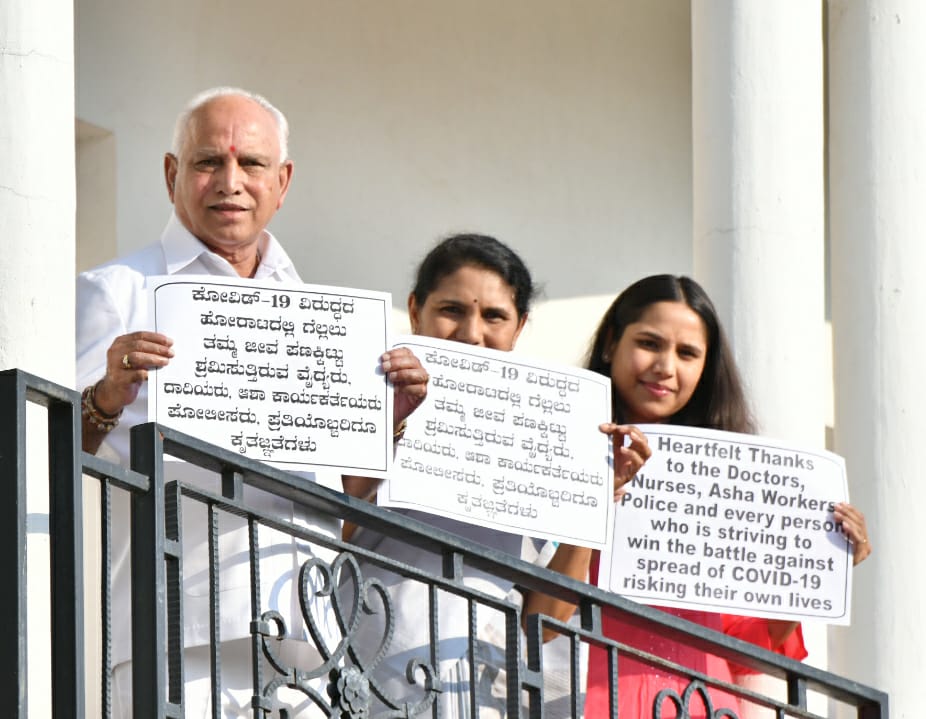 ಇಲ್ಲಿನ ಡಾಲರ್ಸ್ ಕಾಲೋನಿಯಲ್ಲಿರುವ ತಮ್ಮ ಮನೆಯ ಬಾಲ್ಕನಿಯಿಂದ ಬಿ.ಎಸ್.ಯಡಿಯೂರಪ್ಪ ಮತ್ತು ಅವರ ಕುಟುಂಬಸ್ಥರು ಚಪ್ಪಾಳೆ ತಟ್ಟಿದರು. ಅದೇ ರೀತಿ, ಉಪಮುಖ್ಯಮಂತ್ರಿ ಡಾ.ಸಿ.ಎನ್.ಅಶ್ವಥ್ ನಾರಾಯಣ, ಸಚಿವರಾದ ಈಶ್ವರಪ್ಪ, ಬಿ.ಸಿ.ಪಾಟೀಲ್, ಬಿಬಿಎಂಪಿ ಮೇಯರ್ ಗೌತಮ್ ಕುಮಾರ್ ಸೇರಿದಂತೆ ಹಲವು ಮಂದಿ ಚಪ್ಪಾಳೆ ತಟ್ಟಿ ಶ್ರಮಿಕರಿಗೆ ಗೌರವ ಆರ್ಪಿಸಿದರು.