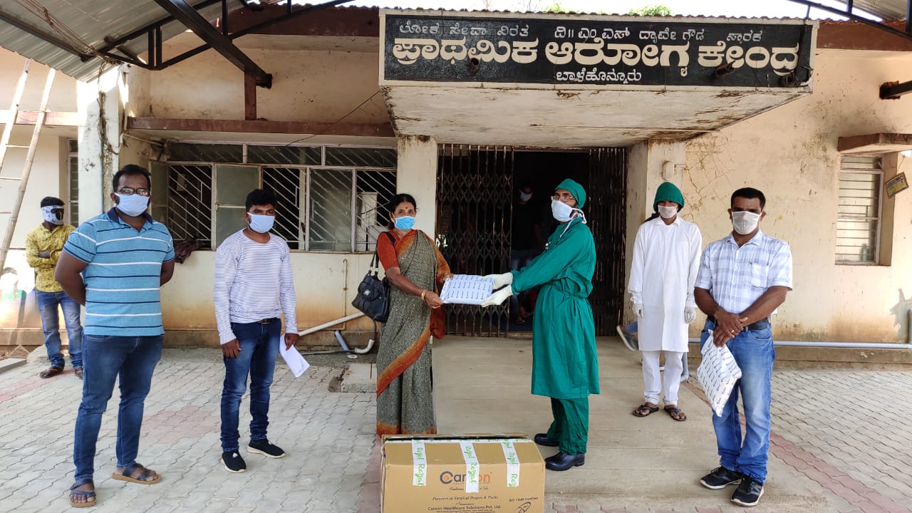 ಬಾಳೆಹೊನ್ನೂರು ಆರೋಗ್ಯ ಕೇಂದ್ರದಲ್ಲಿ ಗ್ರಾಮ ಪಂಚಾಯತ್ ಅಧ್ಯಕ್ಷ ಹೂವಮ್ಮ, ಪಂಚಾಯತ್ ಸದಸ್ಯರಾದ ಇಬ್ರಾಹಿಂ ಶಾಫಿ , ರಫೀಕ್ ಎಸ್.ಕೆ, ಆರಿಫ್ ಅವರು ಆರೋಗ್ಯಾಧಿಕಾರಿ ಡಾ. ಪ್ರವೀಣ್ ಅವರಿಗೂ, ಇಬ್ರಾಹಿಂ ಶಾಫಿ ಅವರು ಬಾಳೆಹೊನ್ನೂರು ಪೊಲೀಸ್ ಠಾಣಾಧಿಕಾರಿಗೆ ಮಾಸ್ಕ್ ಹಾಗು ಕಿಟ್ ಗಳನ್ನು ಹಸ್ತಾಂತರಿಸಿದರು.