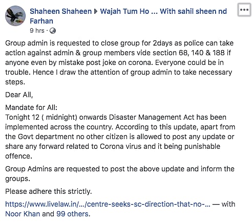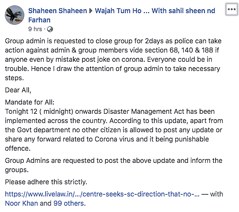 ಇಂದು (ಎಪ್ರಿಲ್ 7) ಮಧ್ಯರಾತ್ರಿಯಿಂದ ವಿಪತ್ತು ನಿರ್ವಹಣಾ ಕಾಯಿದೆ ಜಾರಿಯಾಗಿದೆ ಹಾಗೂ ಯಾವುದೇ ಕೊರೋನ ವೈರಸ್ ಕುರಿತಾದ ಸಂದೇಶವನ್ನು ಶೇರ್ ಮಾಡಲು ಸಾಧ್ಯವಿಲ್ಲ ಎಂದೂ ಅದರಲ್ಲಿ ಬರೆಯಲಾಗಿತ್ತಲ್ಲದೆ ಜತೆಗೆ “Centre Seeks SC Direction That No Media Should Publish COVID-19 News Without First Ascertaining Facts With Govt” ಎಂದು ಬರೆದು Livelaw.inನ ಲಿಂಕ್ ಒಂದನ್ನು ಲಗತ್ತಿಸಲಾಗಿತ್ತು.
