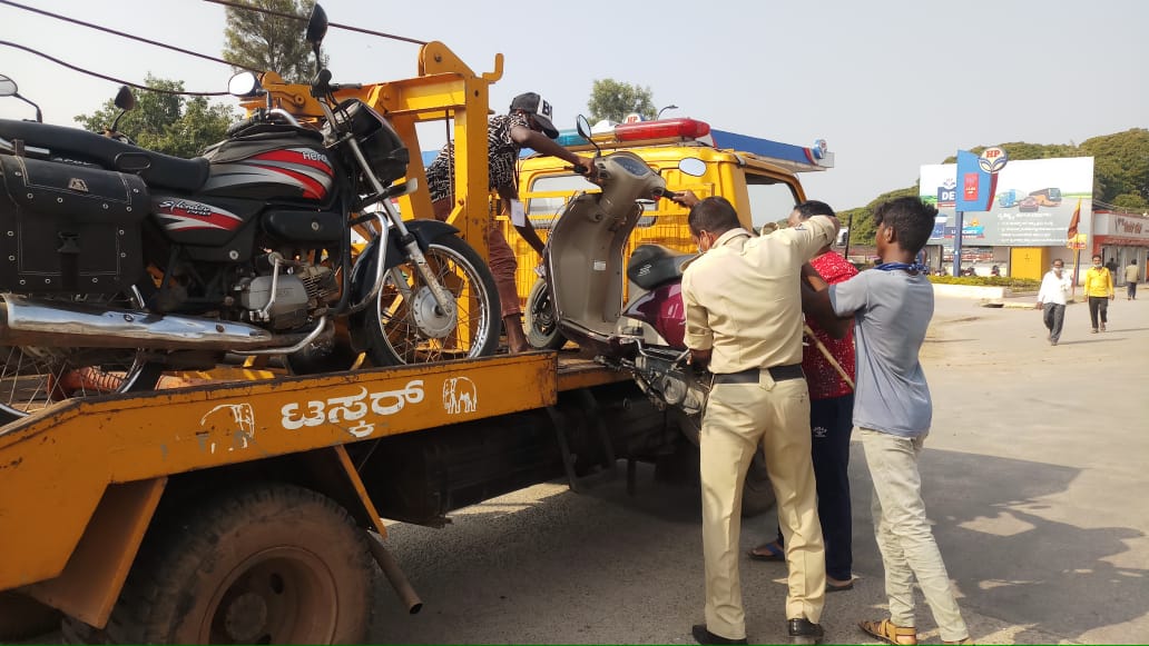 ಕಾರಣವಿಲ್ಲದೇ ತಿರುಗಾಡುವರ ವಾಹನಗಳನ್ನು ಜಪ್ತಿ ಮಾಡುವಂತೆ ಸಿಬ್ಬಂದಿಗೆ ಸೂಚನೆ ನೀಡಿದರು. ಸೂಕ್ತ ದಾಖಲೆ ಪತ್ರಗಳು, ಪಾಸ್ ಇಲ್ಲದೇ ವಾಹನ, ಬೈಕ್ಗಳಲ್ಲಿ ತಿರುಗುತ್ತಿದ್ದವರ ಬೈಕ್ ಸೀಝ್ ಮಾಡಲಾಯಿತು.