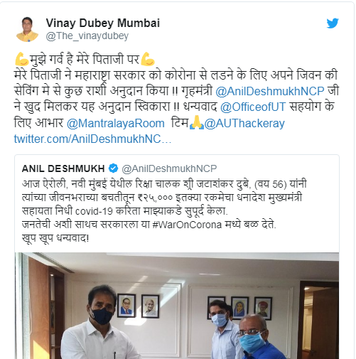 ದೇಶಮುಖ್ ಅವರ ಹಿಂದಿ ಟ್ವೀಟ್ ಹೀಗಿತ್ತು – “ಮುಂಬೈ ರಿಕ್ಷಾ ಚಾಲಕ ಜಟಾಶಂಕರ್ ದುಬೆ ಮುಖ್ಯಮಂತ್ರಿಗಳ ಕೊರೋನ ವೈರಸ್ ನಿಧಿಗಾಗಿ ರೂ 25,000 ದೇಣಿಗೆ ನೀಡಿದ್ದಾರೆ.'' ಇದನ್ನು ಉಲ್ಲೇಖಿಸಿ ವಿನಯ್ ದುಬೆ ಮಾಡಿದ ಟ್ವೀಟ್ ಹೀಗಿತ್ತು - ``ನನ್ನ ತಂದೆಯ ಬಗ್ಗೆ ಹೆಮ್ಮೆಯಿದೆ. ಕೊರೋನ ಹೋರಾಟಕ್ಕಾಗಿ ಅವರು ಮಹಾರಾಷ್ಟ್ರ ಸರಕಾರಕ್ಕೆ ಸ್ವಲ್ಪ ದೇಣಿಗೆ ನೀಡಿದ್ದಾರೆ. ಗೃಹ ಸಚಿವ ಅನಿಲ್ ದೇಶಮುಖ್ ಅವರೇ ಈ ದೇಣಿಗೆ ಸ್ವೀಕರಿಸಿದ್ದರು. ಉದ್ಧವ್ ಠಾಕ್ರೆ ಅವರಿಗೆ ಧನ್ಯವಾದಗಳು. ನಿಮ್ಮ ಸಹಕಾರಕ್ಕೆ ಧನ್ಯವಾದಗಳು''.