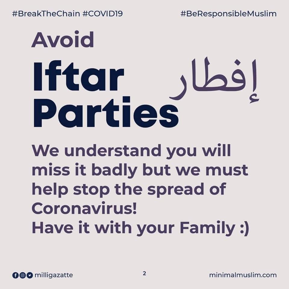 ಇಫ್ತಾರ್ ಕೂಟಗಳನ್ನು ನಡೆಸಬೇಡಿ: “ನೀವು ಇಫ್ತಾರ್ ಕೂಟಗಳನ್ನು ಮಿಸ್ ಮಾಡಿಕೊಳ್ಳುತ್ತೀರಿ ಎಂದು ನಮಗೆ ತಿಳಿದಿದೆ. ಆದರೆ ನಾವು ಕೊರೋನ ವೈರಸ್ ನ್ನು ತಡೆಯಲೇಬೇಕು. ಇಫ್ತಾರ್ ಕೂಟಗಳನ್ನು ನಿಮ್ಮ ಕುಟುಂಬದ ಜೊತೆ ನಡೆಸಿ” ಎಂದು ಬರೆಯಲಾಗಿದೆ.