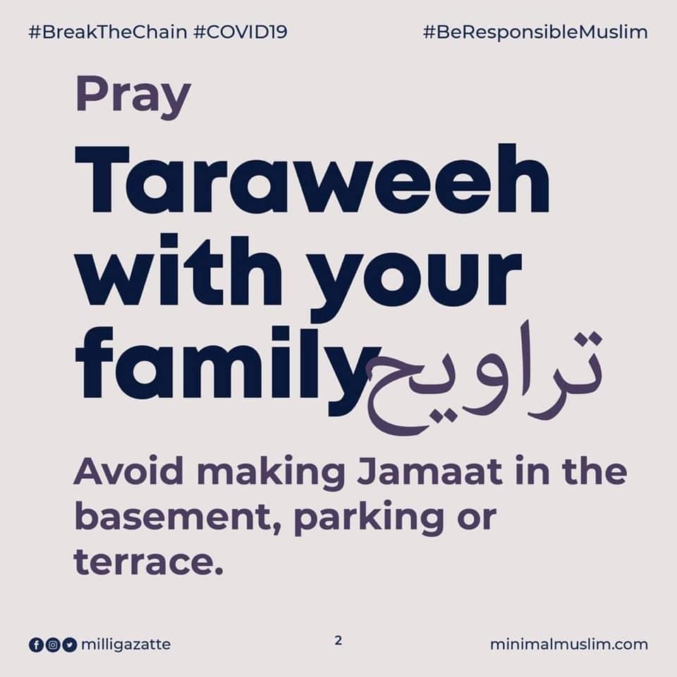 ತರಾವೀಹ್ ಜಮಾಅತ್ ನಡೆಸಬೇಡಿ: ನಿಮ್ಮ ಬೇಸ್ ಮೆಂಟ್ ಗಳು, ಪಾರ್ಕಿಂಗ್ ಅಥವಾ ಟೆರೇಸ್ ಗಳಲ್ಲೂ ತರಾವೀಹ್ ಜಮಾಅತ್ ನಡೆಸಬೇಡಿ. ಕೇವಲ ಕುಟುಂಬದವರು ಅಥವಾ ಮನೆಯಲ್ಲಿದ್ದವರ ಜೊತೆ ಜಮಾಅತ್ ನಡೆಸಿ.