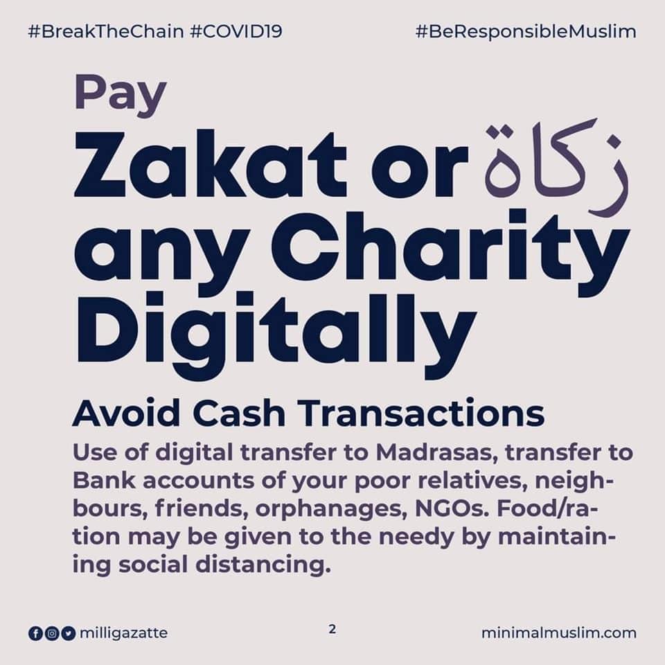 ಝಕಾತ್ ಅಥವಾ ದಾನ.. ಡಿಜಿಟಲ್ ರೂಪದಲ್ಲಿ: ನಗದು ವ್ಯವಹಾರ ಕಡಿಮೆಗೊಳಿಸಿ, ಮದ್ರಸಗಳು, ನಿಮ್ಮ ಬಡ ಕುಟುಂಬಸ್ಥರು, ನೆರೆಹೊರೆಯವರು, ಗೆಳೆಯರು, ಅನಾಥರು, ಎನ್ ಜಿಒಗಳು ಹೀಗೆ ಎಲ್ಲರಿಗೂ ಡಿಜಿಟಲ್ ವ್ಯವಹಾರದ ಮೂಲಕ ಸಹಾಯ ಮಾಡಿ. ಸುರಕ್ಷಿತ ಅಂತರ ಕಾಪಾಡಿಕೊಂಡು ಅಗತ್ಯವಿದ್ದವರಿಗೆ ಪಡಿತರ ವಿತರಿಸಿ.