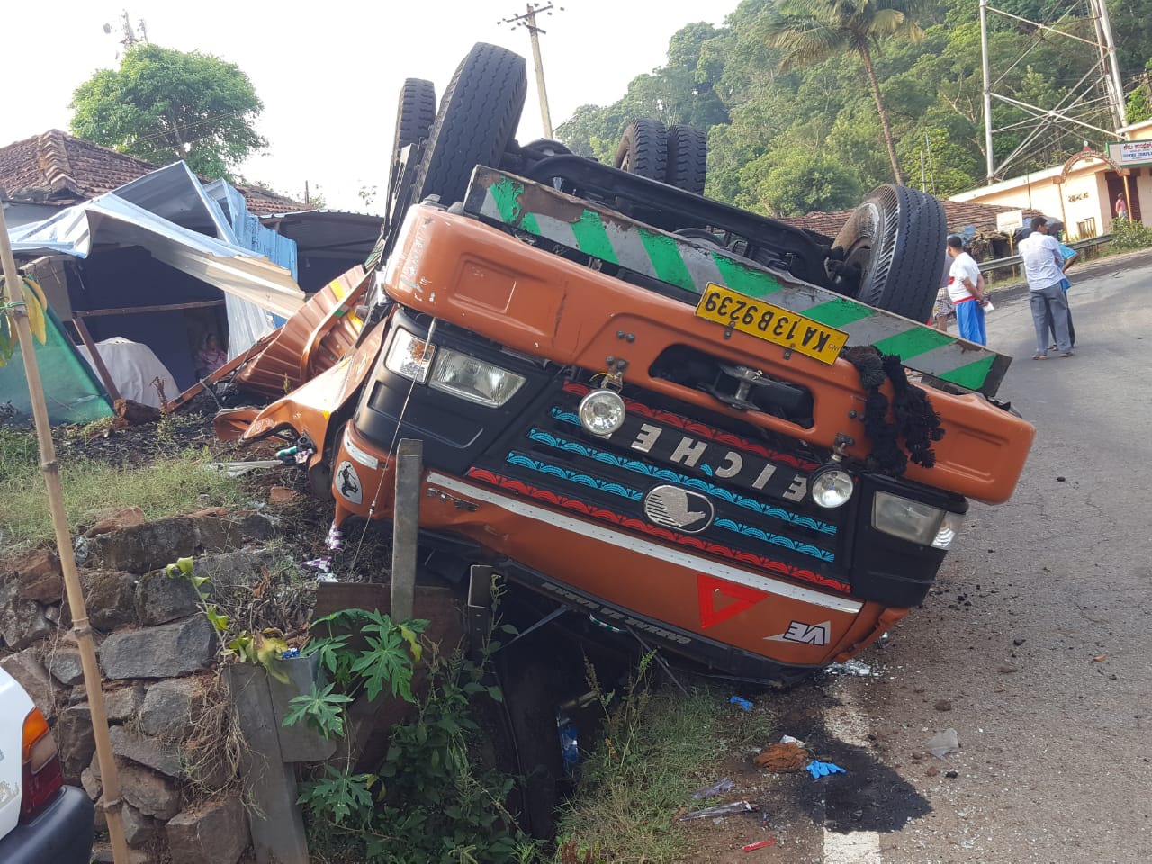 ಹಾಸನ ಮೂಲದ ಲಾರಿ ಮಂಗಳೂರು ಬಂದರಿನಿಂದ ಕೈಗಾರಿಕಾ ಇದ್ದಿಲನ್ನು ತುಂಬಿಕೊಂಡು ಕುಶಾಲನಗರದ ಕಡೆಗೆ ಬರುತ್ತಿತ್ತು. ಈ ಸಂದರ್ಭ ಲಾರಿಯನ್ನು ಸಹಾಯಕ ಚಾಲಕ ಚಲಾಯಿಸುತ್ತಿದ್ದು, ರಾತ್ರಿ 10.30ರ ಸಮಯಕ್ಕೆ ಬೊಯಿಕೇರಿ ಇಳಿಜಾರಿನ ರಸ್ತೆಯಲ್ಲಿ ಲಾರಿ ಚಾಲಕನ ನಿಯಂತ್ರಣ ಕಳೆದುಕೊಂಡು ಮುಂಬದಿಯಿಂದ ಬರುತ್ತಿದ್ದ ಬೇರೊಂದು ಲಾರಿಗೆ ಡಿಕ್ಕಿ ಹೊಡೆದಿದೆ. ಈ ಸಂದರ್ಭ ಲಾರಿಯ ಆ್ಯಕ್ಸಿಲ್ ತುಂಡಾಗಿದ್ದು, ನಿಯಂತ್ರಣಕ್ಕೆ ಬಾರದ ಲಾರಿ ಹೆದ್ದಾರಿ ಬದಿಗೆ ಮಗುಚಿಕೊಂಡಿದೆ. ಇದಕ್ಕೂ ಮುನ್ನ ಮನೆಯ ಮುಂದೆ ನಿಲ್ಲಿಸಿದ್ದ ಡಸ್ಟರ್ ಕಾರಿಗೂ(ಕೆ.ಎ.12.ಪಿ.6686) ಗುದ್ದಿದ್ದು, ಕಾರಿನ ಹಿಂಬದಿಗೆ ಹಾನಿಯಾಗಿದೆ. ಲಾರಿ ಮನೆಯ ಮುಂದೆಯೇ ಮಗುಚಿ ಬಿದ್ದಿದನ್ನು ಕಂಡು ನಿದ್ದೆಯಲ್ಲಿದ್ದ ಮನೆ ಮಂದಿ ಬೆಚ್ಚಿ ಬಿದ್ದಿದ್ದಾರೆ.