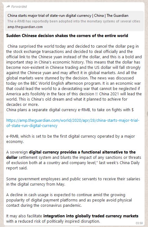 ಅದೇ ಸುದ್ದಿಗೆ ರೆಕ್ಕೆ ಪುಕ್ಕ ಕಟ್ಟಿ ಡಾಲರ್ ಬದಲು ಈ ಡಿಜಿಟಲ್ ಕರೆನ್ಸಿಯನ್ನು ಚೀನಾ ತರುತ್ತಿದ್ದು ಅಲ್ಲಿನ ಕೆಲವು ನಗರ ಪ್ರದೇಶಗಳಲ್ಲಿ ಅದು ಈಗಾಗಲೇ ಚಾಲ್ತಿಯಲ್ಲಿದೆ. ಇನ್ನು ಮುಂದೆ ಯುವಾನ್ ಈ ಡಿಜಿಟಲ್ ಕರೆನ್ಸಿ ಜೊತೆ ವಿನಿಮಯ ಮಾಡಿಕೊಳ್ಳಲಿದೆ. ಅಲ್ಲಿಗೆ ಡಾಲರ್ ಮುಗಿದಂತೆಯೇ ಎಂದೂ ವ್ಯಾಪಕವಾಗಿ ಪ್ರಚಾರ ಮಾಡಲಾಗಿದೆ.