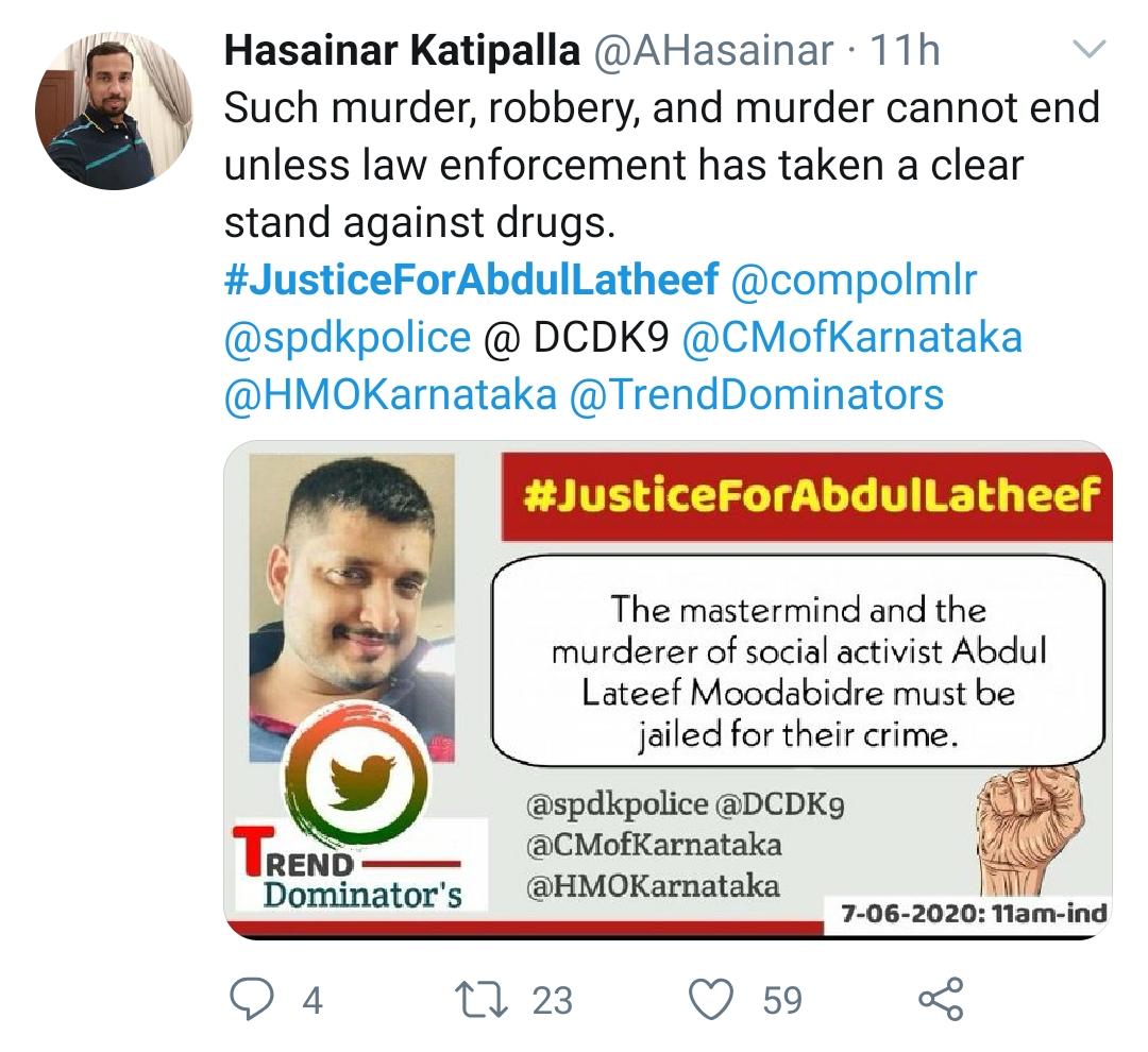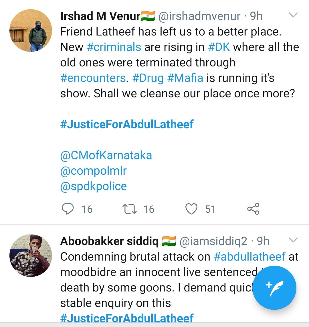 "ಆಪತ್ಭಾಂದವ ಅಬ್ದುಲ್ ಲತೀಫ್ ಅವರ ಕೊಲೆಯ ಹಿಂದಿನ ನೈಜ ಕಾರಣವನ್ನು ಆದಷ್ಟು ಬೇಗ ಬೇಧಿಸಬೇಕು. ಹಾಡುಹಗಲೇ ರಾಜರೋಷವಾಗಿ ಇಷ್ಟೊಂದು ಕ್ರೂರವಾಗಿ ಕೊಲೆಗೈಯಲು ಅವರಿಗೆ ಧೈರ್ಯ ಬಂದಿದ್ದು ಅಮಲು ಪದಾರ್ಥ ಸೇವನೆಯಿಂದಲೋ, ಅಥವಾ ಪ್ರಭಾವಿ ವ್ಯಕ್ತಿಗಳ ಕೈವಾಡವೇ?" ಎಂದು ಟ್ವಿಟರಿಗರೊಬ್ಬರು ಪ್ರಶ್ನಿಸಿದ್ದಾರೆ.