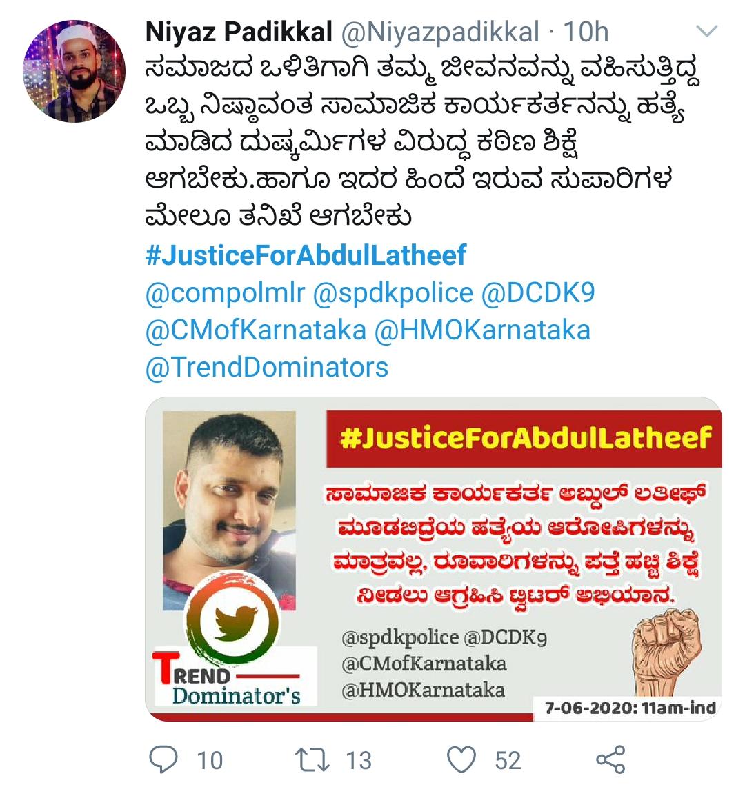 ಮುಲ್ಕಿಯ ಉದ್ಯಮಿ ಹತ್ಯೆ ಆರೋಪಿಗಳ ಬಂಧನಕ್ಕೆ ಆಗ್ರಹ: ಟ್ವಿಟರ್ ನಲ್ಲಿ #JusticeForAbdulLatheef ಟ್ರೆಂಡಿಂಗ್