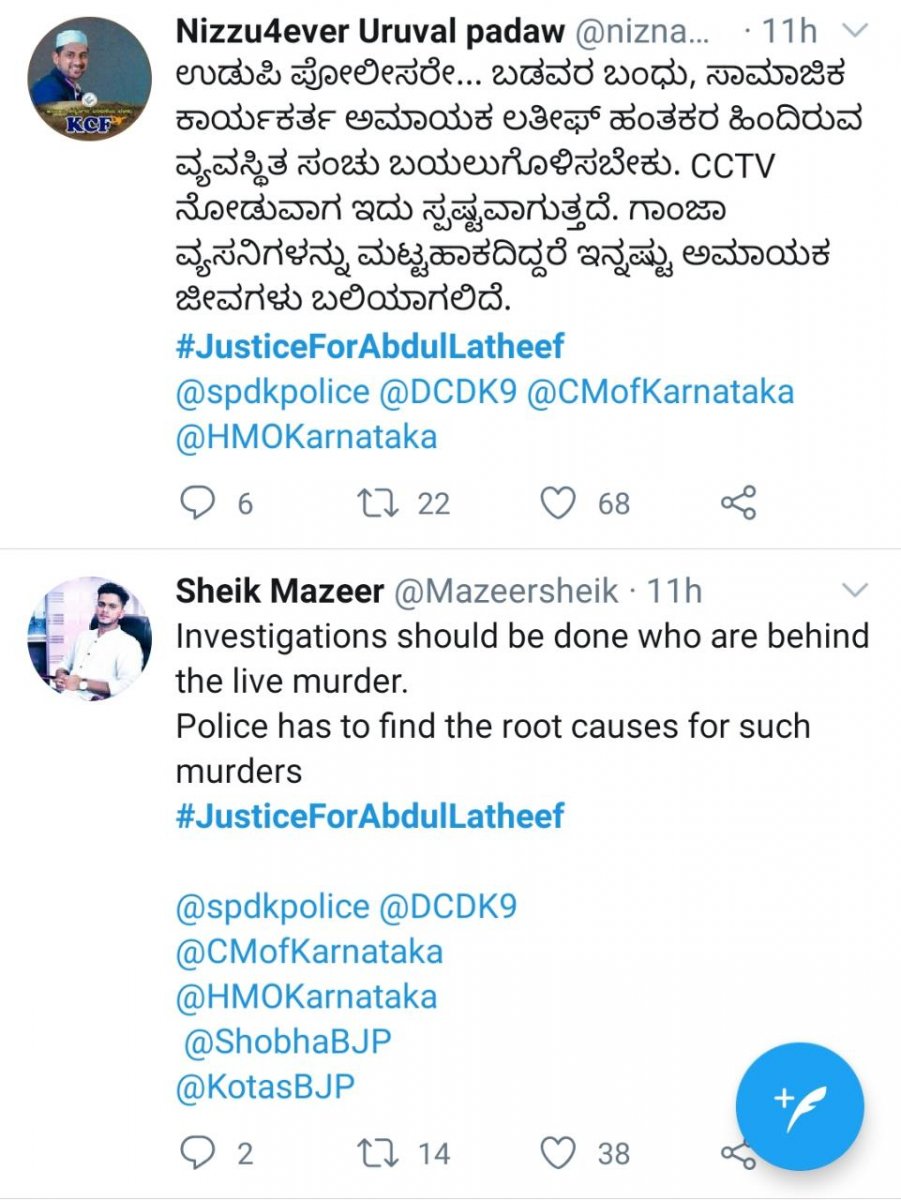"ಬಡವರಿಗೆ ಜಾತಿ ಮತ ನೋಡದೆ ಸಹಾಯ ಮಾಡುತ್ತಿದ್ದ ಅಬ್ದುಲ್ ಲತೀಫ್ ಯಾಕೆ ಕೊಲೆಯಾದರು. ವೈರತ್ವವನ್ನು ಕಟ್ಟಿಕೊಳ್ಳದ ಸ್ನೇಹ ಜೀವಿಗಳಿಗೆಲ್ಲಿಂದ ವೈರಿಗಳು? ಸಂಶಯ, ಸಂದೇಹಗಳಿಗೆ ಕಾರಣಗಳಿವೆ ಈ ಕೊಲೆಯಲ್ಲಿ", "ಆರೋಪಿಗಳಲ್ಲ, ರೂವಾರಿಗಳನ್ನು ಹೆಡೆಮುರಿಕಟ್ಟಿ ಸಮಾಜಕ್ಕೆ ಪರಿಚಯಿಸಬೇಕು. ಆಗಲೇ ಸಮಾಜದ ಸ್ವಾಸ್ಥ್ಯ ಕಾಪಾಡಬಹುದು" ಎಂದು ಟ್ವೀಟರಿಗರು ಆಗ್ರಹಿಸಿದ್ದಾರೆ.