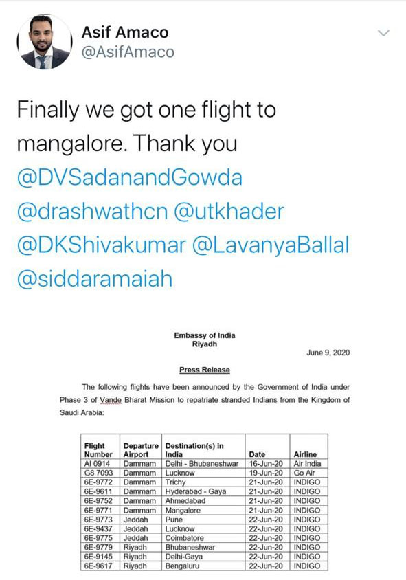 ಕೇಂದ್ರ ಹಾಗು ರಾಜ್ಯ ಸರಕಾರದ ಹಲವು ಸಚಿವರುಗಳ ಜೊತೆ ವೀಡಿಯೊ ಸಂವಾದ ನಡೆಸಿ ಸೌದಿಯಿಂದ ತಕ್ಷಣ ವಿಮಾನ ವ್ಯವಸ್ಥೆ ಮಾಡುವಂತೆ ಹಲವಾರು ಬಾರಿ ಮನವಿ ಮಾಡಿದ್ದರು. ಆದರೆ ವಂದೇ ಭಾರತ್ ಯೋಜನೆಯಲ್ಲಿ ವಿದೇಶದಿಂದ ಅತಂತ್ರ ಭಾರತೀಯರನ್ನು ಕರೆತರಲು ವಿಶೇಷ ವಿಮಾನ ಸೇವೆ ಪ್ರಾರಂಭವಾದಾಗ ಸೌದಿಯಿಂದ ಕರ್ನಾಟಕಕ್ಕೆ ಅದರಲ್ಲೂ ವಿಶೇಷವಾಗಿ ಮಂಗಳೂರಿಗೆ ವಿಮಾನಗಳು ನಿಗದಿಯಾಗಿರಲಿಲ್ಲ. ಈ ಬಗ್ಗೆ ವ್ಯಾಪಕ ಅಸಮಾಧಾನ ಹಾಗು ಆಕ್ರೋಶ ವ್ಯಕ್ತವಾಗಿತ್ತು.