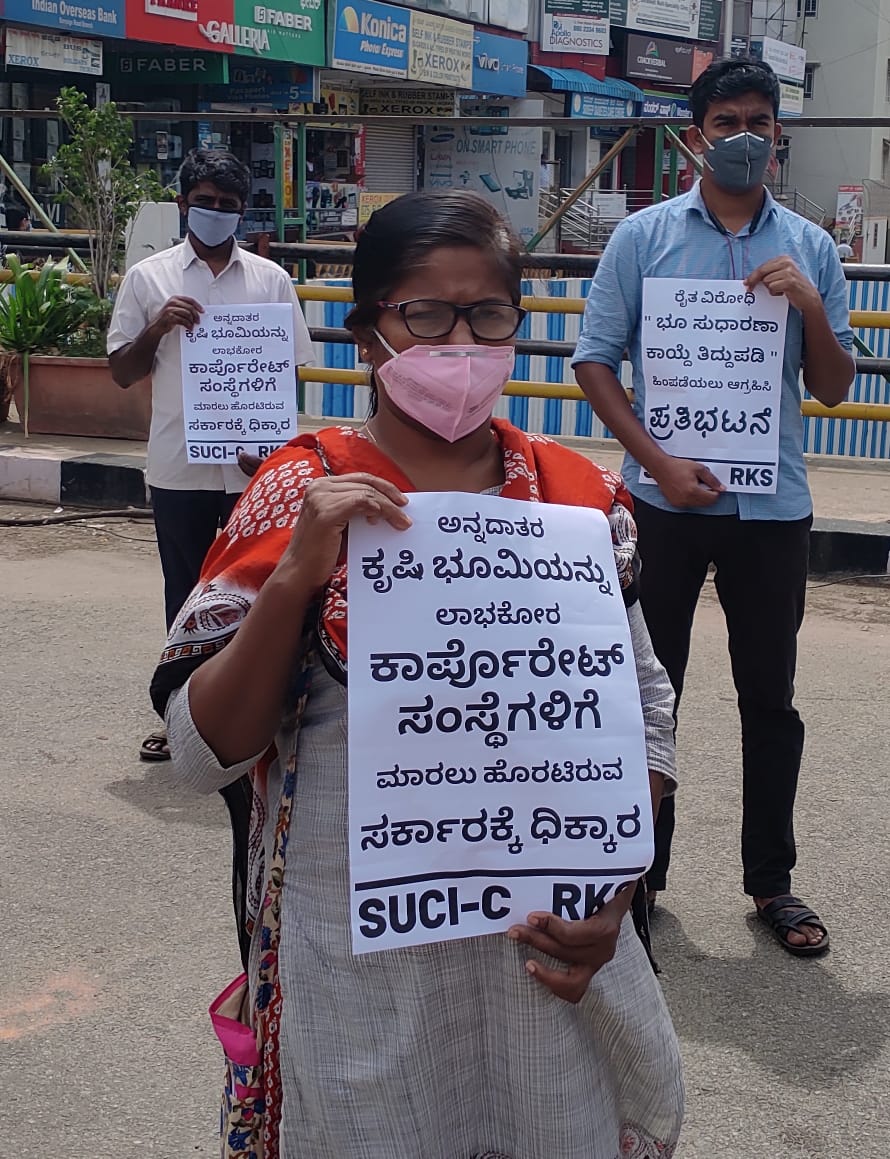ಮಂಗಳವಾರ ನಗರದ ಮಲ್ಲೇಶ್ವರಂ ವೃತ್ತದಲ್ಲಿನ ರಾಷ್ಟ್ರಕವಿ ಕುವೆಂಪು ಪುತ್ಥಳಿ ಎದುರು ಎಸ್ಯುಸಿಐ ಪಕ್ಷ ಮತ್ತು ರೈತ ಕೃಷಿ ಕಾರ್ಮಿಕರ ಸಂಘಟನೆ (ಆರ್ಕೆಎಸ್) ಜಂಟಿಯಾಗಿ ಪ್ರತಿಭಟನೆ ನಡೆಸಿದವು. ಈ ಪ್ರತಿಭಟನಾ ಸಭೆಯ ಅಧ್ಯಕ್ಷತೆ ವಹಿಸಿ ಮಾತನಾಡಿದ ಪಕ್ಷದ ಸದಸ್ಯರಾದ ಕೃಷ್ಣ, ಕೊರೊನಾ ಲಾಕ್ಡೌನ್ ಹಿನ್ನೆಲೆಯಲ್ಲಿ ರೈತರು ತತ್ತರಿಸುತ್ತಿರುವಾಗ, ಅವರ ನೆರವಿಗೆ ಬರಬೇಕಾದ ಸರಕಾರ, ರೈತರ ಭೂಮಿಯನ್ನೇ ಕಾರ್ಪೊರೇಟ್ ಕಂಪೆನಿಗಳ ಕಪಿಮುಷ್ಠಿಗೆ ಹಾಕುವಂತಹ ಭೂ ಸುಧಾರಣೆ ಕಾಯ್ದೆಯನ್ನು ಜಾರಿಗೊಳಿಸಿದೆ ಎಂದು ದೂರಿದರು.