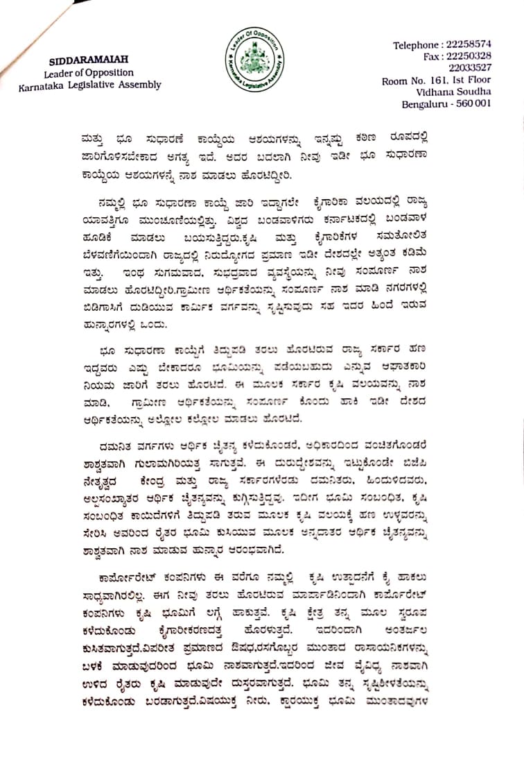 `ಉಳುವವನೆ ಹೊಲದ ಒಡೆಯನೆಂಬ ಕಾಗೋಡು ಸತ್ಯಾಗ್ರಹದ ಆಶಯವನ್ನು ನೀವು ಉಳ್ಳವನೆ ಭೂಮಿಯ ಒಡೆಯ ಎಂದು ಬದಲಾಯಿಸಿ ರಾಜ್ಯದ ಚರಿತ್ರೆಯಲ್ಲಿ ಶಾಶ್ವತವಾಗಿ ಖಳನಾಯಕನ ಪಾತ್ರವನ್ನು ವಹಿಸಿಕೊಳ್ಳಲು ಹೊರಟಿದ್ದೀರಿ. ಹಾಗಾಗಲು ಬಿಡದೆ ಕರ್ನಾಟಕ ಭೂ ಸುಧಾರಣಾ ಕಾಯ್ದೆಯನ್ನು ದುರ್ಬಲಗೊಳಿಸದೆ ಕಾಯ್ದೆಯ ಆಶಯಗಳನ್ನು ಇನ್ನಷ್ಟು ಶಕ್ತಗೊಳಿಸಬೇಕು' ಎಂದು ಸಿದ್ದರಾಮಯ್ಯ ಆಗ್ರಹಿಸಿದ್ದಾರೆ.