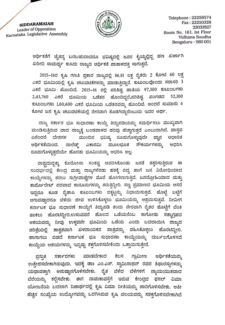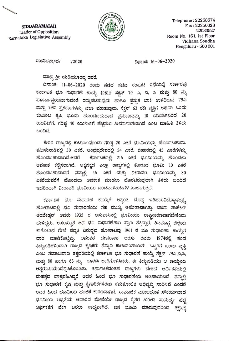 ಭೂ ಸುಧಾರಣಾ ಕಾಯ್ದೆ ತಿದ್ದುಪಡಿ ಕೈ ಬಿಡುವಂತೆ ಸಿಎಂಗೆ ಸಿದ್ದರಾಮಯ್ಯ ಪತ್ರ