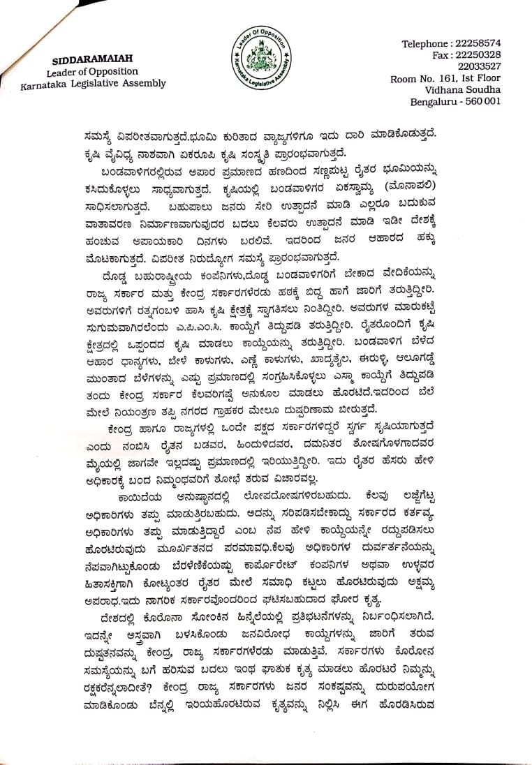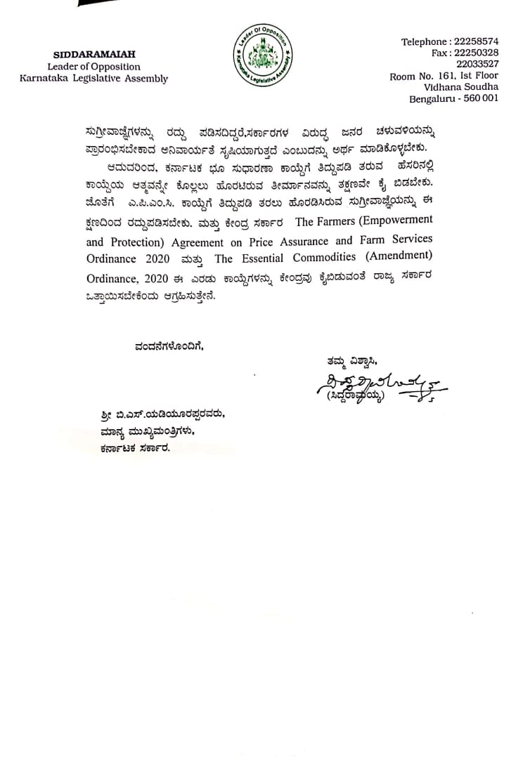 ಬೆಂಗಳೂರು, ಜೂ. 17: 'ಕರ್ನಾಟಕ ಭೂ ಸುಧಾರಣಾ ಕಾಯ್ದೆಗೆ ತಿದ್ದುಪಡಿ ತರುವ ನಿರ್ಧಾರ ಕೈಬಿಡಬೇಕು ಹಾಗೂ ಎಪಿಎಂಸಿ ಕಾಯ್ದೆಗೆ ತಿದ್ದುಪಡಿ ತರಲು ಹೊರಡಿಸಿರುವ ಸುಗ್ರೀವಾಜ್ಞೆಯನ್ನು ರದ್ದುಪಡಿಸಬೇಕು. ಇಲ್ಲವಾದರೆ ಕೇಂದ್ರ ಮತ್ತು ರಾಜ್ಯ ಸರಕಾರಗಳ ವಿರುದ್ಧ ಜನರ ಚಳವಳಿ ರೂಪಿಸುವುದು ಅನಿವಾರ್ಯವಾಗುತ್ತದೆ' ಎಂದು ವಿಪಕ್ಷ ನಾಯಕ ಸಿದ್ದರಾಮಯ್ಯ, ಮುಖ್ಯಮಂತ್ರಿ ಯಡಿಯೂರಪ್ಪನವರಿಗೆ ಪತ್ರ ಬರೆದಿದ್ದಾರೆ.