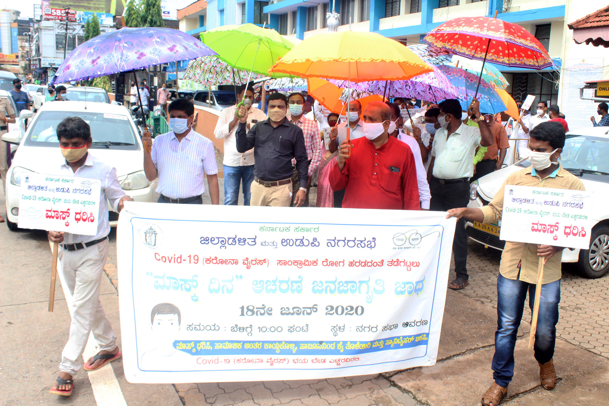 ಮಾಸ್ಕ್ ಜಾಗೃತಿ ಮೂಡಿಸಲು ಹಮ್ಮಿಕೊಳ್ಳಲಾದ ಮೆರವಣಿಗೆಯಲ್ಲಿ ಸುರಕ್ಷಿತ ಅಂತರ ಕಾಪಾಡುಲು ಉಡುಪಿ ನಗರಸಭೆಯು ‘ಛತ್ರಿ’ ವಿಶಿಷ್ಟ ಪ್ರಯೋಗ ವನ್ನು ಕಂಡುಕೊಂಡಿದೆ.