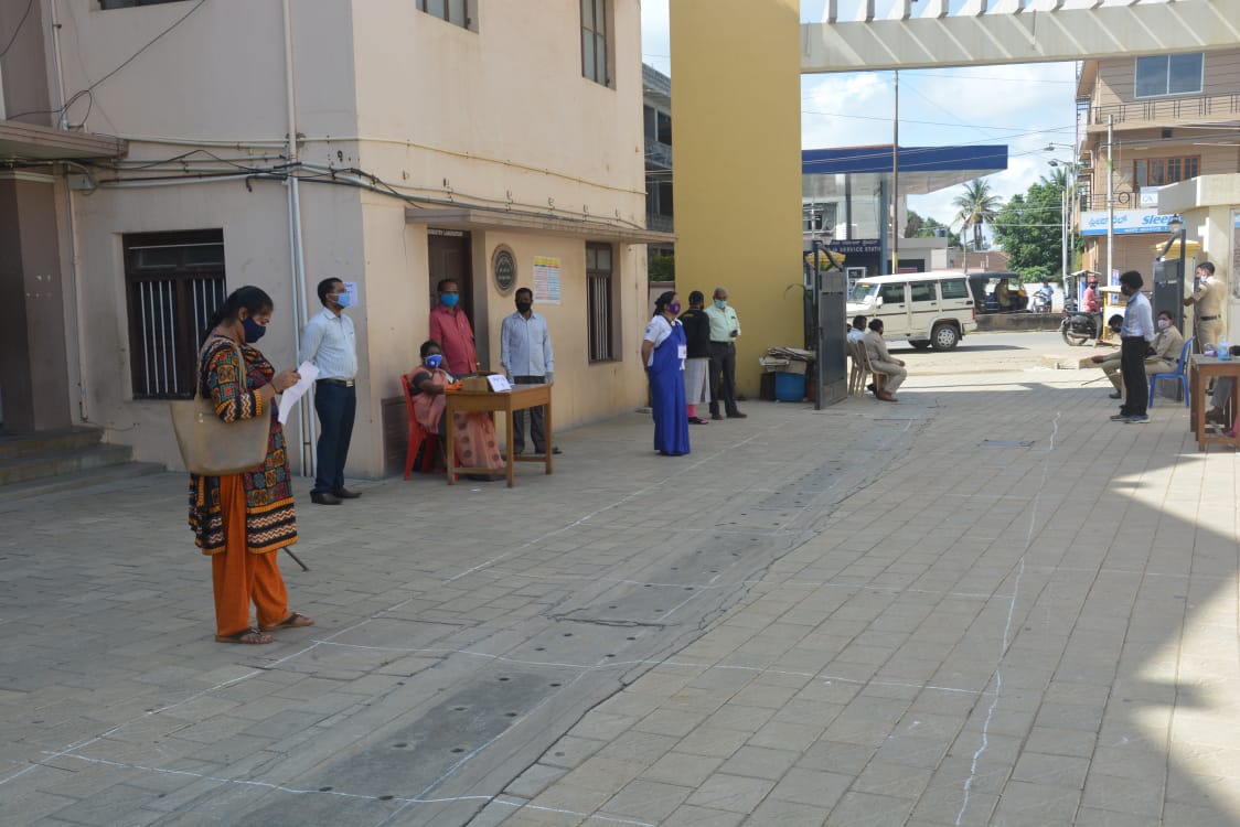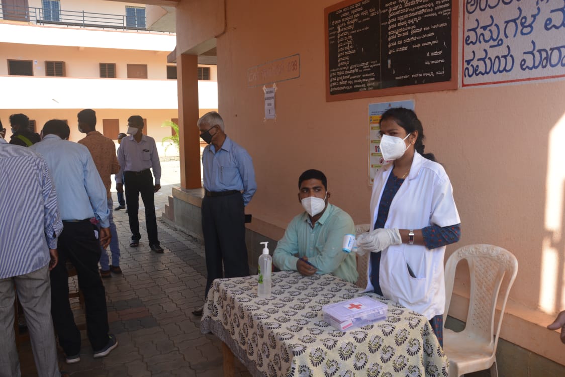 ಪ್ರತೀ ಪರೀಕ್ಷಾ ಕೇಂದ್ರದಲ್ಲೂ ಬೆಳಗ್ಗೆ 8ರ ನಂತರ ವಿದ್ಯಾರ್ಥಿಗಳು ಹಾಜರಾಗುತ್ತಿದ್ದಂತೆ ಸುರಕ್ಷಿತ ಅಂತರ ಕಾಯ್ದುಕೊಳ್ಳಲು ಹಾಕಲಾಗಿದ್ದ ಬಾಕ್ಸ್ ಮಾರ್ಕ್ಗಳಲ್ಲಿ ಸರತಿ ಸಾಲಿನಲ್ಲಿ ನಿಲ್ಲಿಸಿ ಆರೋಗ್ಯ ಇಲಾಖೆ ಸಿಬ್ಬಂದಿ ಹಾಗೂ ಆಶಾ ಕಾರ್ಯಕರ್ತೆಯರು ಸ್ಯಾನಿಟೈಸರ್ ನೀಡಿದರು. ನಂತರ ಥರ್ಮಲ್ ಸ್ಕ್ಯಾನಿಂಗ್ ಒಳಪಡಿಸಿ ಮಾಸ್ಕ್ ಧರಿಸಿದ ನಂತರವೇ ಪರೀಕ್ಷಾ ಕೊಠಡಿಯೊಳಗೆ ಪ್ರವೇಶಕ್ಕೆ ಅವಕಾಶ ಕಲ್ಪಿಸಲಾಯಿತು.