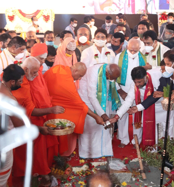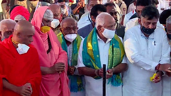 ಬೆಂಗಳೂರು, ಜೂ.27: ನಗರದ ಕೆಂಪೇಗೌಡ ಅಂತರ್ರಾಷ್ಟ್ರೀಯ ವಿಮಾನ ನಿಲ್ದಾಣದಲ್ಲಿ ಸ್ಥಾಪಿಸಲು ಉದ್ದೇಶಿಸಲಾಗಿರುವ 108 ಅಡಿ ಎತ್ತರದ ನಾಡಪ್ರಭು ಕೆಂಪೇಗೌಡರ ಕಂಚಿನ ಪ್ರತಿಮೆ ಹಾಗೂ 23 ಎಕರೆ ಪ್ರದೇಶದಲ್ಲಿ ಸೆಂಟ್ರಲ್ ಪಾರ್ಕ್ ನಿರ್ಮಾಣಕ್ಕೆ ಮುಖ್ಯಮಂತ್ರಿ ಬಿ.ಎಸ್. ಯಡಿಯೂರಪ್ಪಶನಿವಾರ ಬೆಳಗ್ಗೆ ಶಿಲಾನ್ಯಾಸ ನೆರವೇರಿಸಿದರು.