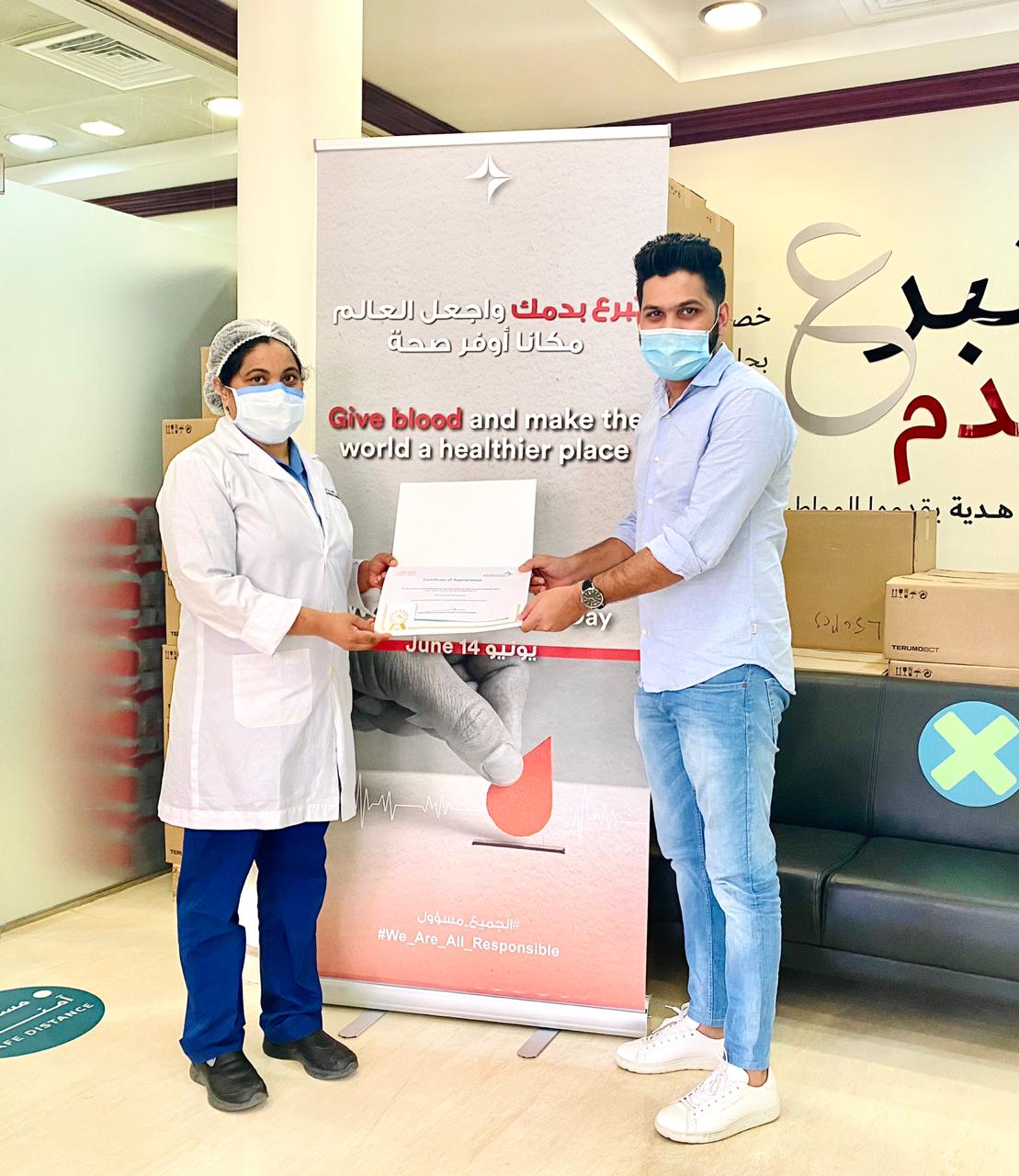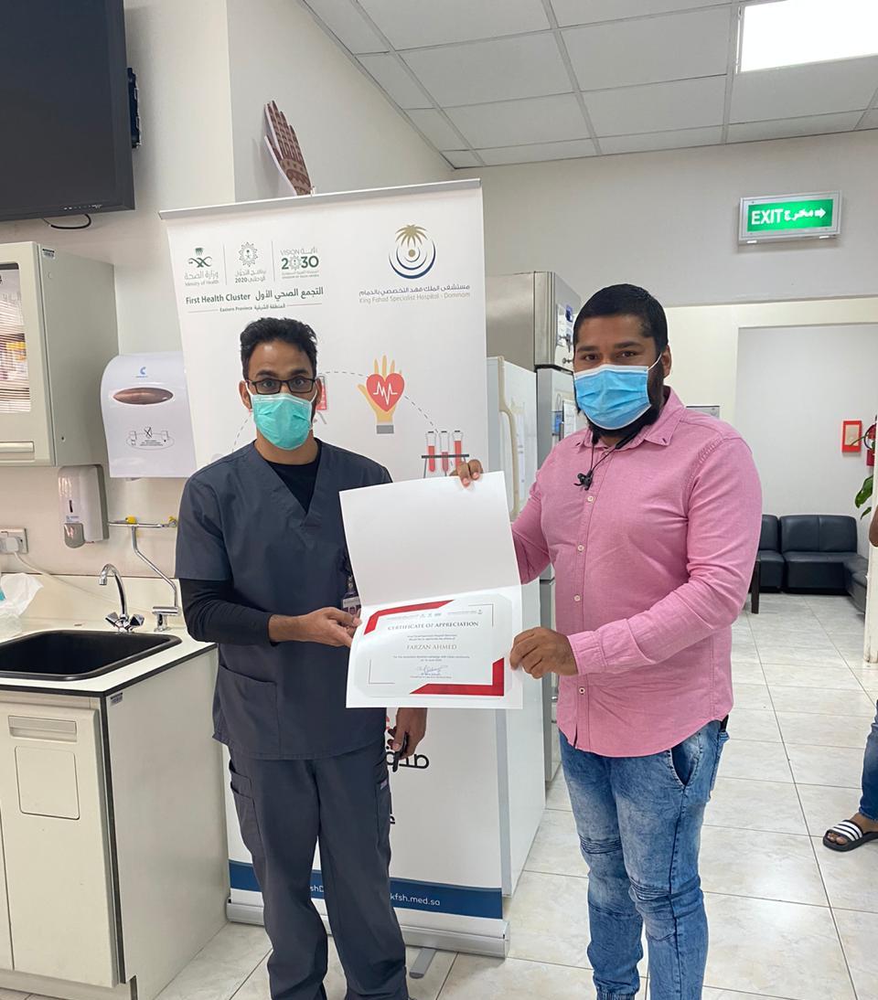 ವಿಶ್ವ ರಕ್ತದಾನಿಗಳ ದಿನದ ಪ್ರಯುಕ್ತ ಜೂನ್ 14 ರಂದು ಬ್ಲಡ್ ಡೋನರ್ಸ್ ಮಂಗಳೂರು ಮತ್ತು ಇಂಡಿಯನ್ ಸೋಶಿಯಲ್ ಫಾರಂ ದಮಾಮ್ ಇದರ ಅಧೀನದಲ್ಲಿ ಸೌದಿ ಅರೇಬಿಯಾದ ಕಿಂಗ್ ಫಹದ್ ಸ್ಪೆಷಲಿಸ್ಟ್ ಆಸ್ಪತ್ರೆಯಲ್ಲಿ ನಡೆದ ರಕ್ತದಾನ ಶಿಬಿರದ ಯಶಸ್ಸಿಗೆ ಮೆಚ್ಚುಗೆ ವ್ಯಕ್ತಪಡಿಸಿ, ದಮಾಮ್ ಕಿಂಗ್ ಪಹದ್ ಸ್ಪೆಷಲಿಸ್ಟ್ ಆಸ್ಪತ್ರೆಯ ವತಿಯಿಂದ ಬ್ಲಡ್ ಡೋನರ್ಸ್ ಮಂಗಳೂರು ಮತ್ತು ರಕ್ತದಾನ ಶಿಬಿರದ ರೂವಾರಿ ಪರ್ಝಾನ್ ಸಿದ್ದಕಟ್ಟೆ ಅವರಿಗೆ ಪ್ರಶಂಸನಾ ಪತ್ರ ನೀಡಿ ಗೌರವಿಸಲಾಯಿತು.