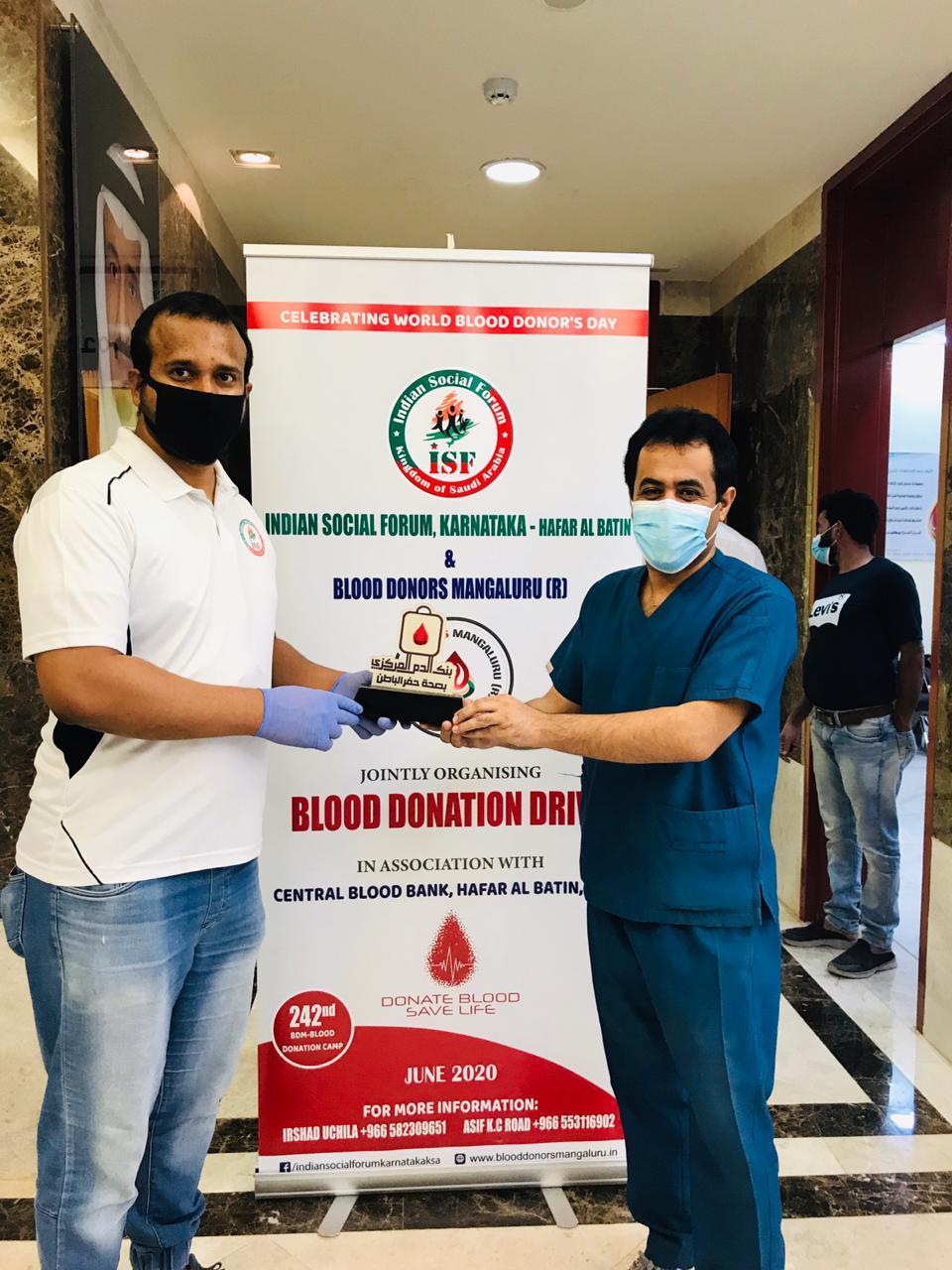 ವಿಶ್ವ ರಕ್ತದಾನಿಗಳ ದಿನದ ಪ್ರಯುಕ್ತ ಇಂಡಿಯನ್ ಸೋಷಿಯಲ್ ಫೋರಂ, ಕರ್ನಾಟಕ - ಹಫರ್ ಅಲ್ ಬಾತಿನ್ ಹಾಗೂ ಬ್ಲಡ್ ಡೋನರ್ಸ್ ಮಂಗಳೂರು(ರಿ) ಜಂಟಿ ಸಹಭಾಗಿತ್ವದಲ್ಲಿ ಸೆಂಟ್ರಲ್ ಬ್ಲಡ್ ಬ್ಯಾಂಕ್ ಹಫರ್ ಅಲ್ ಬಾತಿನ್, ಸೌದಿ ಅರೇಬಿಯಾ ಇದರ ಸಹಕಾರದೊಂದಿಗೆ ನಡೆದ ರಕ್ತದಾನ ಶಿಬಿರದ ಆಯೋಜನೆಗೆ ಬ್ಲಡ್ ಡೋನರ್ಸ್ ಮಂಗಳೂರು ಸಂಸ್ಥೆಗೆ ಮತ್ತು ಯಶಸ್ವಿನ ರೂವಾರಿ ಇರ್ಶಾದ್ ಉಚ್ಚಿಲ ಇವರನ್ನು ಸೆಂಟ್ರಲ್ ಬ್ಲಡ್ ಬ್ಯಾಂಕ್ ಹಫರ್ ಅಲ್ ಬಾತಿನ್ ಮುಖ್ಯಸ್ಥರು ಸ್ಮರಣಿಕೆ ನೀಡಿ ಗೌರವಿಸಲಾಯಿತು.