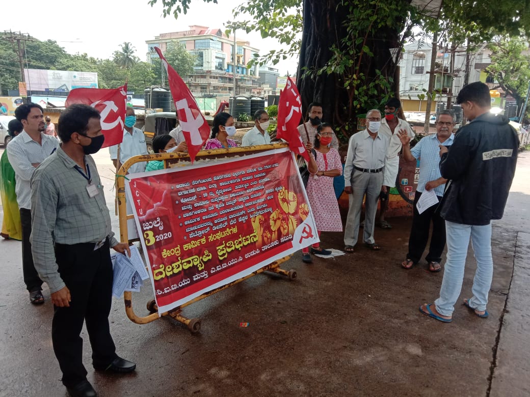 ಧರಣಿಯಲ್ಲಿ ಎಐಟಿಯುಸಿ ಮುಖಂಡರಾದ ಕೆ.ವಿ.ಭಟ್, ಸಂಜೀವ, ಸಿಐಟಿಯು ಮುಖಂಡರಾದ ಶಶಿಧರ ಗೊಲ್ಲ. ಉಮೇಶ್ ಕುಂದರ್, ಕವಿರಾಜ್ ಎಸ್., ನಳಿನಿ ಮೊದಲಾದವರು ಉಪಸ್ಥಿತರಿದ್ದರು.