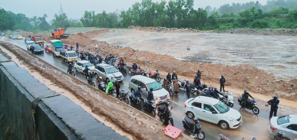 ಎರಡು ದಿನಗಳಿಂದ ಸತತ ಮಳೆಯಾಗುತ್ತಿದ್ದರಿಂದ ಕಾರವಾರ ತಾಲೂಕಿನ ಅಮದಳ್ಳಿ ಗ್ರಾಪಂ ವ್ಯಾಪ್ತಿಯ ಮುದಗಾ ಬಳಿ ಗುಡ್ಡದಿಂದ ಭಾರೀ ಪ್ರಮಾಣದಲ್ಲಿ ನೀರು ಹರಿದು ಬಂದು ರಾಷ್ಟ್ರೀಯ ಹೆದಾರಿ ಸಂಪೂರ್ಣ ಬಂದ್ ಆಗಿತ್ತು. ಐಆರ್ಬಿಯ ಕಾಮಗಾರಿ ಅವೈಜ್ಞಾನಿಕವಾಗಿ ನಡೆಸಿದ್ದರಿಂದ ರಾಷ್ಟ್ರೀಯ ಹೆದ್ದಾರಿ ಸಂಪೂರ್ಣ ಜಲಾವೃತಗೊಂಡಿದೆ ಎಂದು ಆರೋಪಿಸಲಾಗಿದೆ.