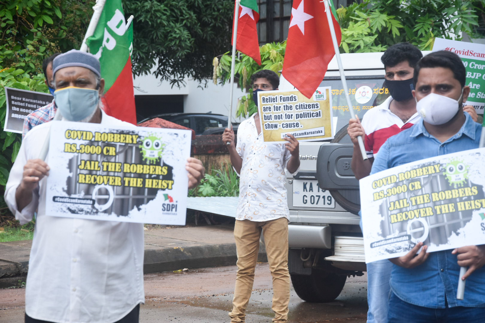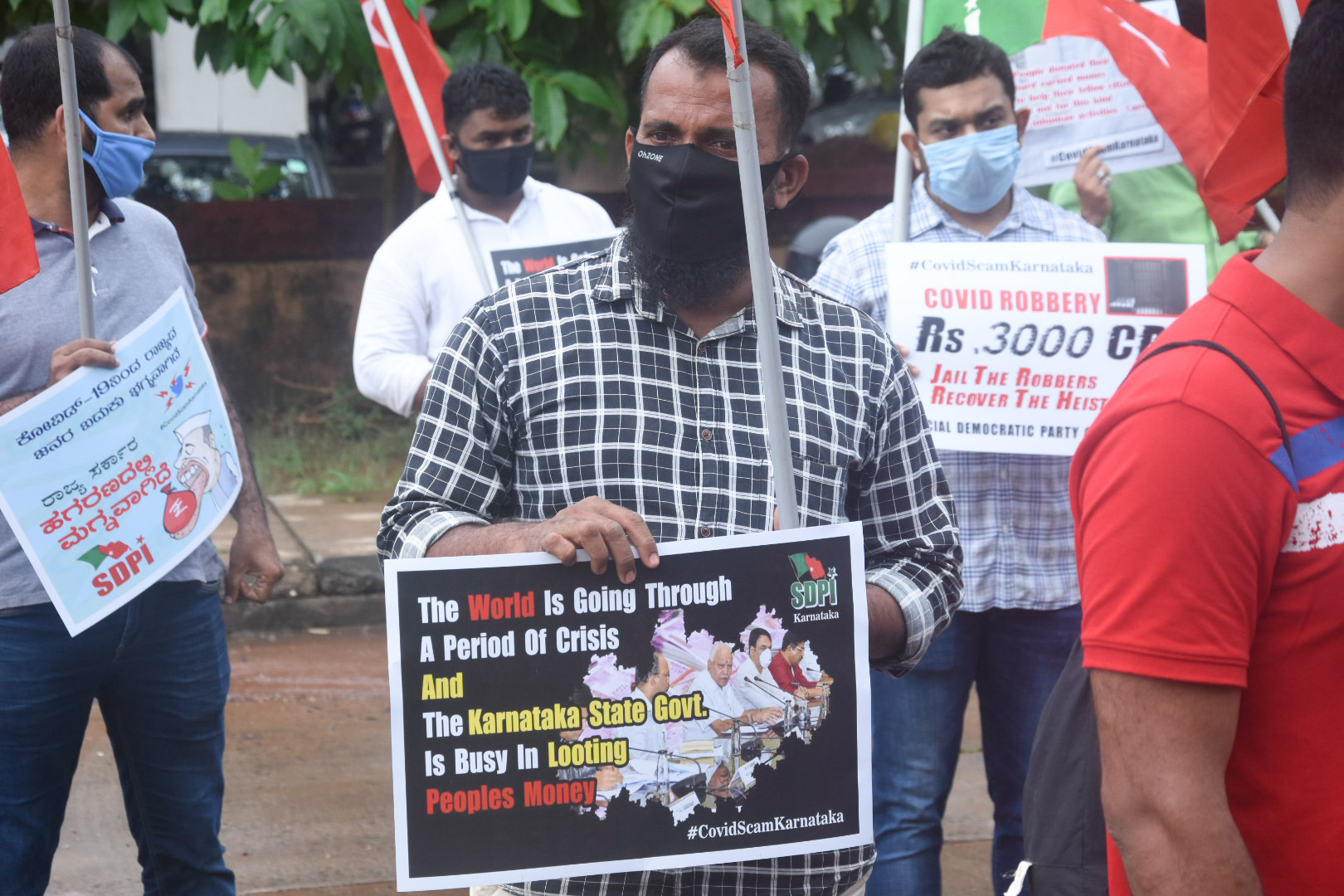 ಮಂಗಳೂರು, ಜು.13: ಕೋವಿಡ್ 19 ನಿಯಂತ್ರಣದ ಹೆಸರಿನಲ್ಲಿ ರಾಜ್ಯ ಸರಕಾರವು ಲೂಟಿ ಆರಂಭಿಸಿದೆ. ಕೋಟ್ಯಂತರ ರೂಪಾಯಿ ಖರ್ಚು ಮಾಡಿದ್ದರೂ ಕೂಡ ಯಾವ್ಯಾವುದಕ್ಕೆ ಖರ್ಚು ಮಾಡಲಾಗಿದೆ ಎಂಬುದರ ಬಗ್ಗೆ ಸ್ಪಷ್ಪ ಮಾಹಿತಿ ಇಲ್ಲ. ಕೊರೋನ ರೋಗದಂತಹ ಈ ಸಂದರ್ಭದಲ್ಲಿ ಜನಸಾಮಾನ್ಯರಿಗೆ ನೆರವು ನೀಡಬೇಕಾದ ಸರಕಾರ ಹಗರಣದಲ್ಲಿ ಭಾಗಿಯಾಗಿವೆ ಎಂದು ಆರೋಪಿಸಿ ಸೋಶಿಯಲ್ ಡೆಮಾಕ್ರಟಿಕ್ ಪಾರ್ಟಿ ಆಫ್ ಇಂಡಿಯಾದ ಮಂಗಳೂರು ನಗರ ದಕ್ಷಿಣ ವಿಧಾನಸಭಾ ಕ್ಷೇತ್ರ ಸಮಿತಿಯ ವತಿಯಿಂದ ಸೋಮವಾರ ನಗರದ ಪುರಭವನದ ಬಳಿ ಪ್ರತಿಭಟನೆ ನಡೆಯಿತು.
