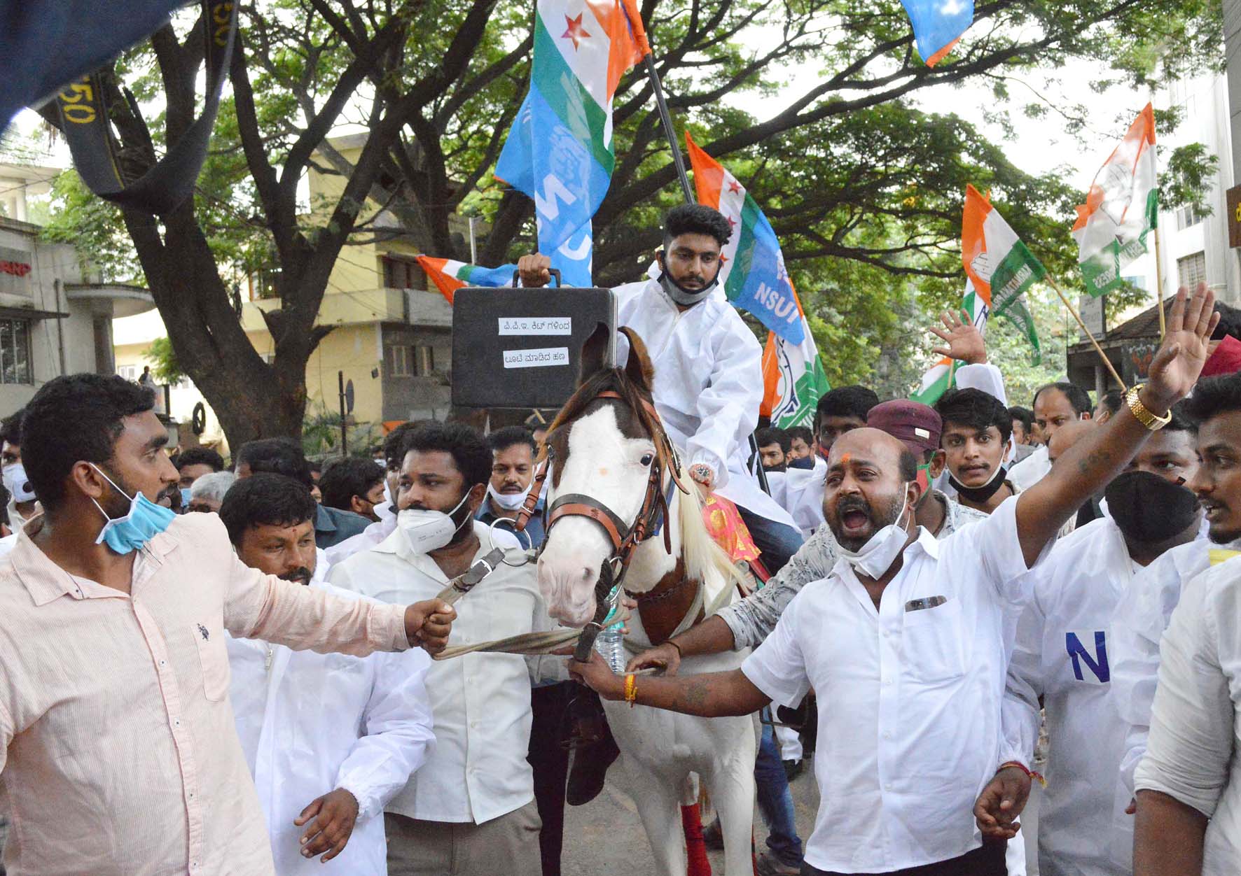 ರಾಜಭವನಕ್ಕೆ ತೆರಳದಂತೆ ತಡೆದ ಪೊಲೀಸರು: ಕೆಪಿಸಿಸಿ ಕಚೇರಿಯಿಂದ ರಾಜಭವನದ ವರೆಗೆ ಕಾಲ್ನಡಿಗೆಯಲ್ಲಿ ಸಾಗಿದ ಕಾಂಗ್ರೆಸ್ ಮುಖಂಡರನ್ನು ಪೊಲೀಸರು ತಡೆದರು. ಆನಂತರ, ಅಲ್ಲಿಯೆ ಪ್ರತಿಭಟನೆ ನಡೆಸಿದ ಕಾಂಗ್ರೆಸ್ ಮುಖಂಡರನ್ನು ಬಂಧಿಸಿ, ಅಶೋಕ ನಗರ ಪೊಲೀಸ್ ಠಾಣೆಗೆ ಕರೆದೊಯ್ದು ಬಳಿಕ ಬಿಡುಗಡೆ ಮಾಡಲಾಯಿತು.