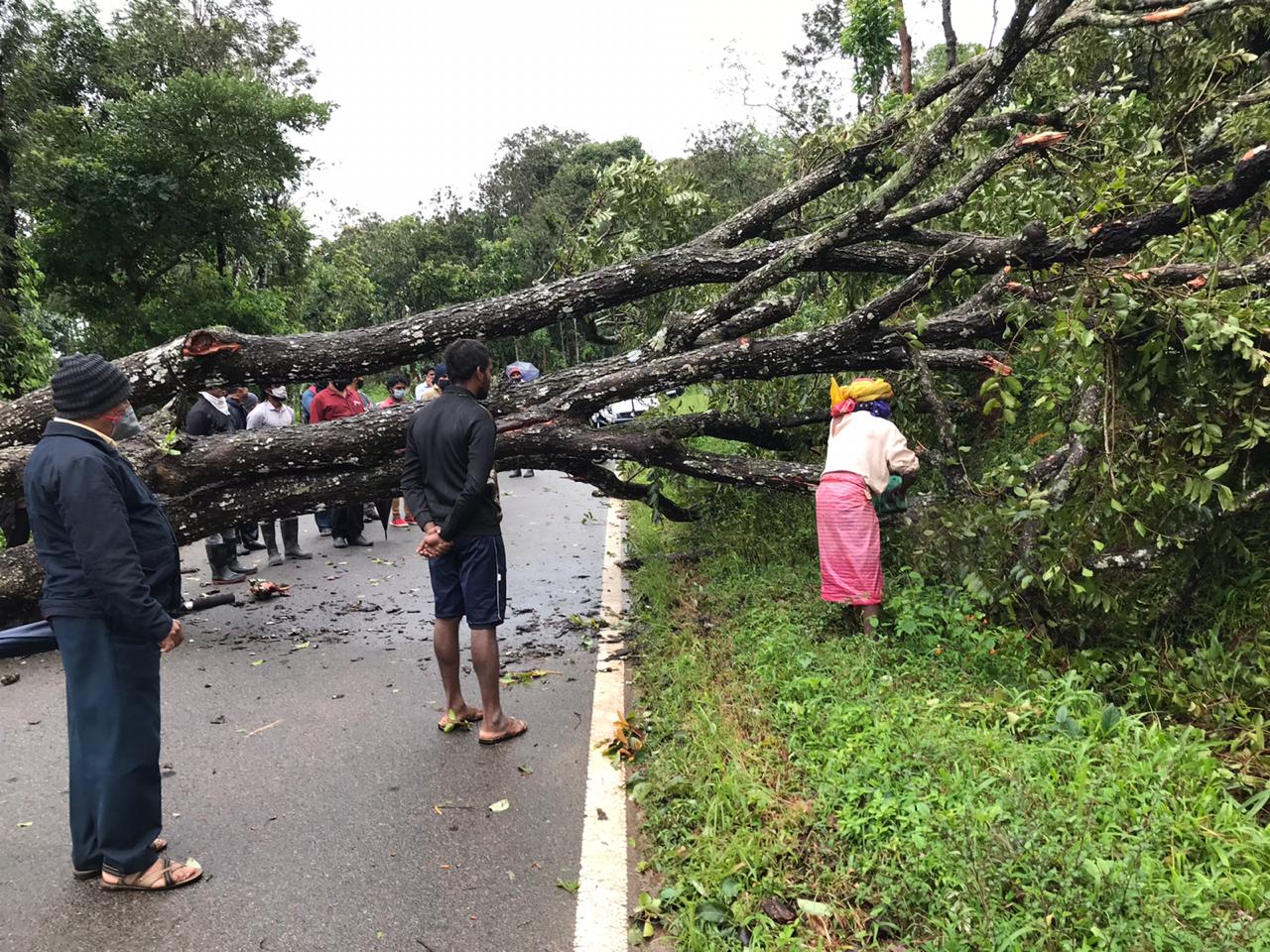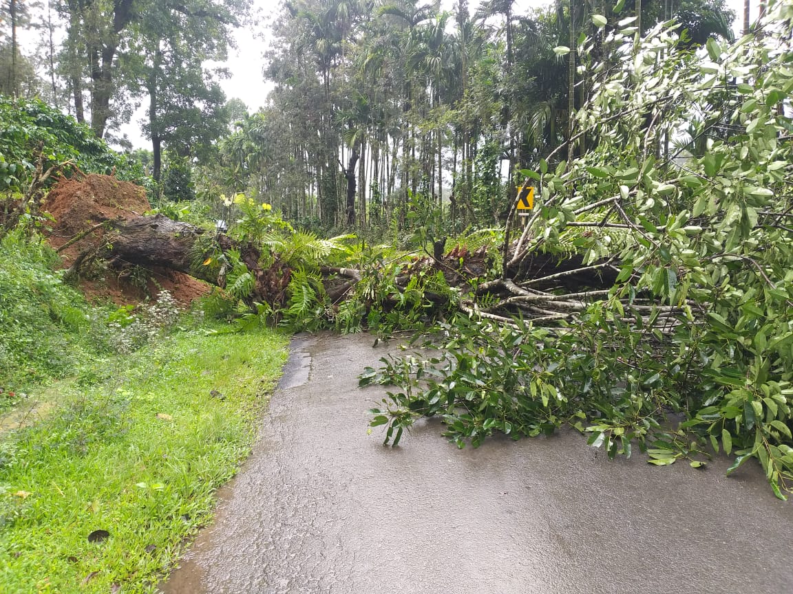 ಮಡಿಕೇರಿ-ವೀರಾಜಪೇಟೆ ಮುಖ್ಯ ರಸ್ತೆಯ ಬೇತ್ರಿ, ಹಾಲುಗುಂದ ಮತ್ತು ಸುಂಟಿಕೊಪ್ಪ ವ್ಯಾಪ್ತಿಯಲ್ಲಿ ರಸ್ತೆಗೆ ಅಡ್ಡಲಾಗಿ ಮರಗಳು ಬಿದ್ದಿವೆ. ಹಾಲುಗುಂದ ಗ್ರಾಮದ ಮುಖ್ಯ ರಸ್ತೆಯಲ್ಲಿ ಭಾರೀ ಗಾತ್ರದ ಮರವೊಂದು ರಸ್ತೆಗುರುಳಿದೆ.