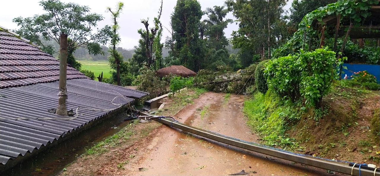 ಸಕಲೇಶಪುರ: ತಾಲ್ಲೂಕಿನಲ್ಲಿ ಮುಂಗಾರು ಮಳೆ ಆರ್ಭಟ ಮತ್ತಷ್ಟು ಹೆಚ್ಚಾಗಿದ್ದು, ಭಾರೀ ವೇಗವಾಗಿ ಬೀಸುತ್ತಿರುವ ಗಾಳಿ ಹಾಗೂ ಮಳೆಗೆ ಹಲವು ಮನೆಗಳ ಮೇಲ್ಚಾವಣಿಗಳೆ ಹಾರಿ ಹೋಗಿವೆ. ನೂರಾರು ಮರಗಳು, ವಿದ್ಯುತ್ ಕಂಬಗಳು ಧರೆಗುರುಳಿದ್ದು ಜನ ಜೀವನ ಅಸ್ತವ್ಯಸ್ತಗೊಂಡಿದೆ.