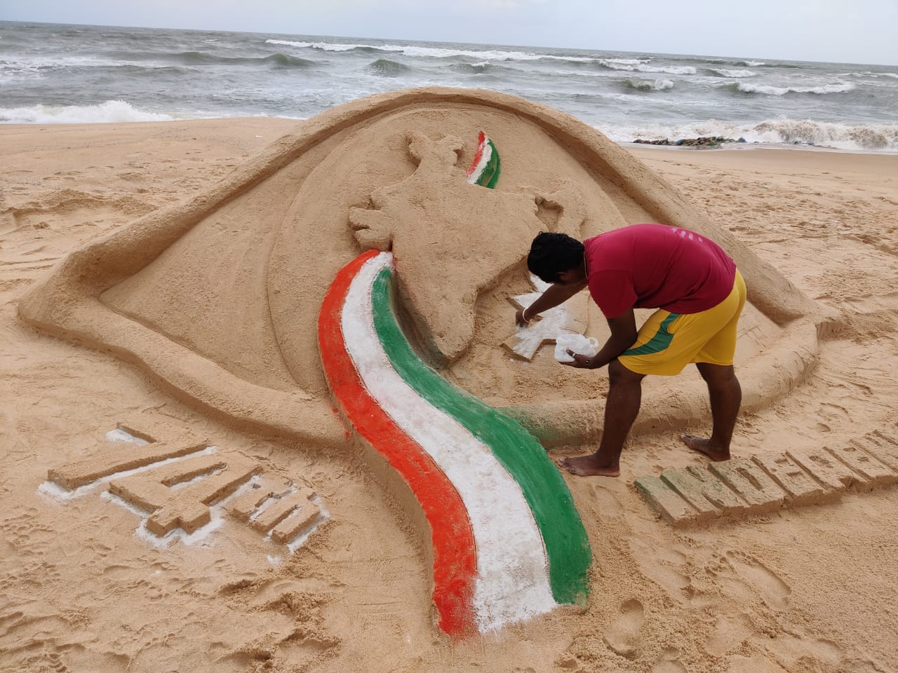 ಮಂಗಳೂರು, ಆ.15: ಸ್ವಾತಂತ್ರ ದಿನಾಚರಣೆಯ ಅಂಗವಾಗಿ ಮಂಗಳೂರಿನ ಪಣಂಬೂರು ಬೀಚ್ನಲ್ಲಿ ಶನಿವಾರ ಮರಳು ಕಲಾಕೃತಿಯು ಸಾರ್ವಜನಿಕರ ಗಮನ ಸೆಳೆದಿದೆ.