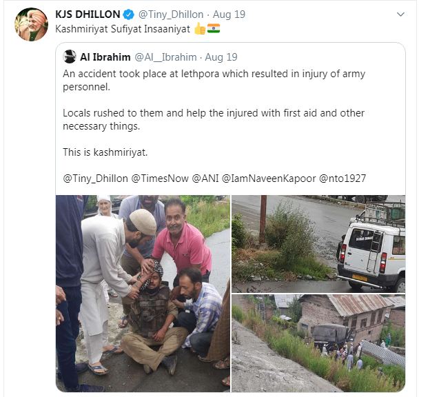 ಶ್ರೀನಗರ,ಆ.20: ಕಾಶ್ಮೀರದ ಪುಲ್ವಾಮಾ ಜಿಲ್ಲೆಯ ಲೇತ್ಪೊರಾದಲ್ಲಿ ರಸ್ತೆ ಅಪಘಾತದಲ್ಲಿ ಗಾಯಗೊಂಡಿದ್ದ ಸೈನಿಕರಿಗೆ ಸ್ಥಳೀಯರು ನೆರವಾಗುವ ಚಿತ್ರವೊಂದು ಸಾಮಾಜಿಕ ಜಾಲತಾಣಗಳಲ್ಲಿ ಸಾಕಷ್ಟು ವೈರಲ್ ಆಗಿದೆ. ಈ ಛಾಯಾಚಿತ್ರದಿಂದ ಪ್ರೇರಿತವಾಗಿ ಭಾರತೀಯ ಸೇನಾಪಡೆಯ ಲೆಫ್ಟಿನೆಂಟ್ ಜನರಲ್ ಜೀತ್ಸಿಂಗ್ ಧಿಲ್ಲೋನ್ ಅವರು ‘ಕಾಶ್ಮೀರಿಯತ್ ಸೂಫಿಯತ್ ಇನ್ಸಾನಿಯತ್ ’ ಎಂಬ ಹೃದಯಸ್ಪರ್ಶಿ ಸಂದೇಶದೊಂದಿಗೆ ಟ್ವೀಟ್ ಮಾಡಿದ್ದಾರೆ.