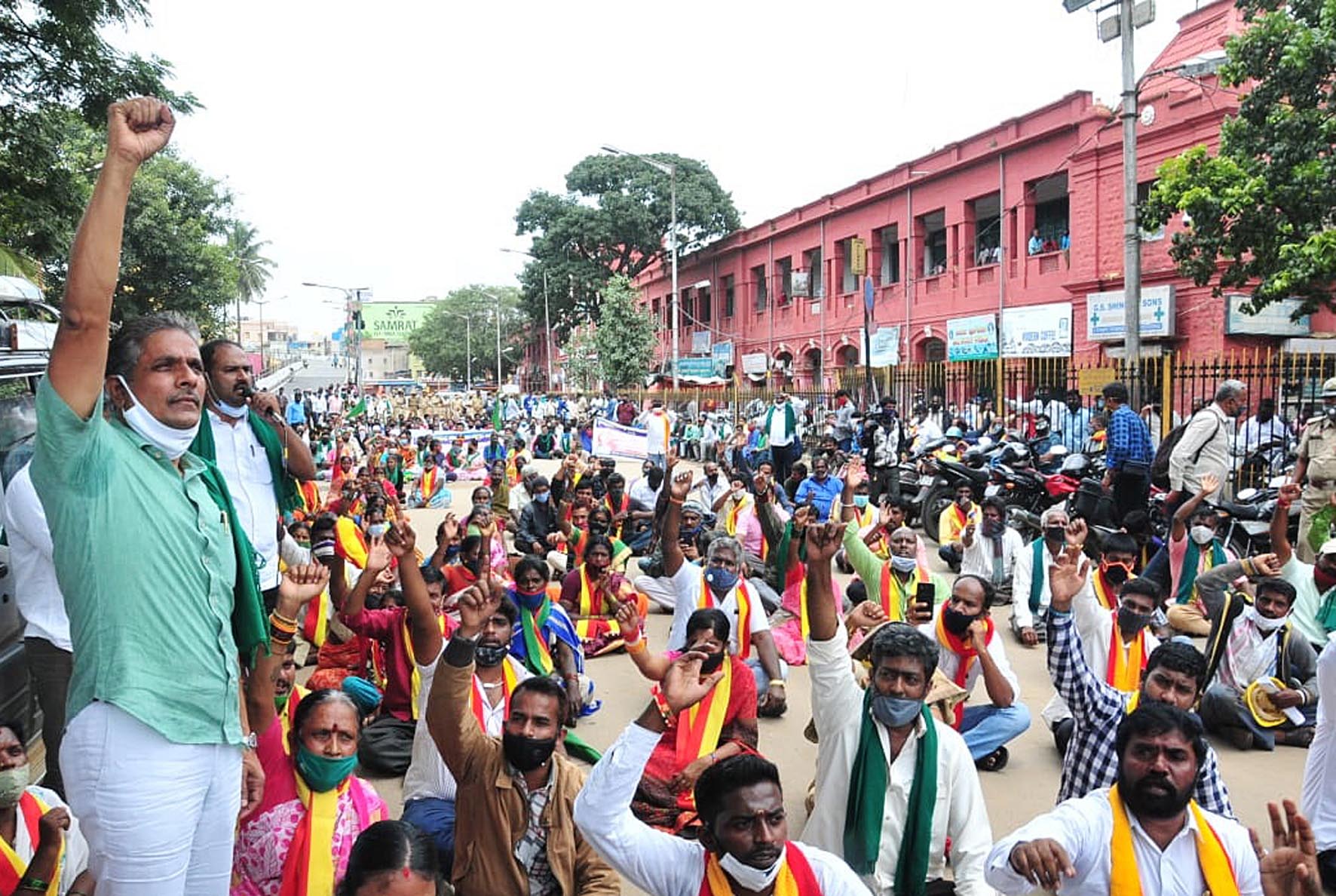 ಈ ಸಂದರ್ಭದಲ್ಲಿ ಮಾತನಾಡಿದ ರಾಜ್ಯ ರೈತ ಸಂಘದ ಅಧ್ಯಕ್ಷ ಕೋಡಿಹಳ್ಳಿ ಚಂದ್ರಶೇಖರ್, ಕೊರೋನ ಹಿನ್ನಲೆ ಕಲಾಸಿಪಾಳ್ಯ ಹಾಗೂ ಕೆ.ಆರ್ ಮಾರುಕಟ್ಟೆಯನ್ನು ಬಂದ್ ಮಾಡಿದ್ದರಿಂದ ರೈತರಿಗೆ ಸಾಕಷ್ಟು ನಷ್ಟ ಉಂಟಾಗಿದೆ. ಪ್ರತಿದಿನ ಸಾವಿರಾರು ರೈತರು ಈ ಮಾರುಕಟ್ಟೆಗಳಿಗೆ ತಾವು ಬೆಳೆದ ಹಣ್ಣು, ತರಕಾರಿ, ಹೂವು ತಂದು ಮಾರುತ್ತಿದ್ದರು. ಕೊರೋನ ಕಾರಣದಿಂದಾಗಿ ಮಾರುಕಟ್ಟೆ ಬಂದ್ ಆದ್ದರಿಂದ ರೈತರು ತಾವು ಬೆಳೆದ ಬೆಳೆಯನ್ನು ಅರ್ಧ ಬೆಲೆಗೆ ಮಾರಾಟ ಮಾಡುವ ಪರಿಸ್ಥಿತಿ ನಿರ್ಮಾಣವಾಗಿದೆ. ಆದ್ದರಿಂದ ಕೂಡಲೇ ಮಾರುಕಟ್ಟೆ ಪ್ರಾರಂಭ ಮಾಡಬೇಕು ಎಂದು ಒತ್ತಾಯಿಸಿದರು.